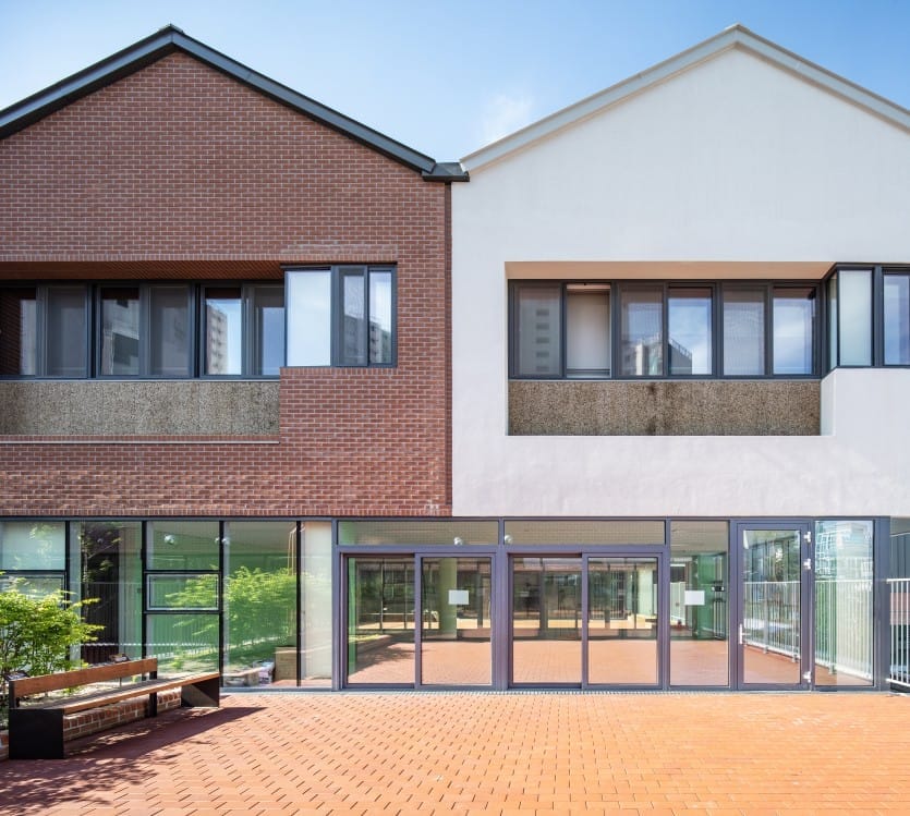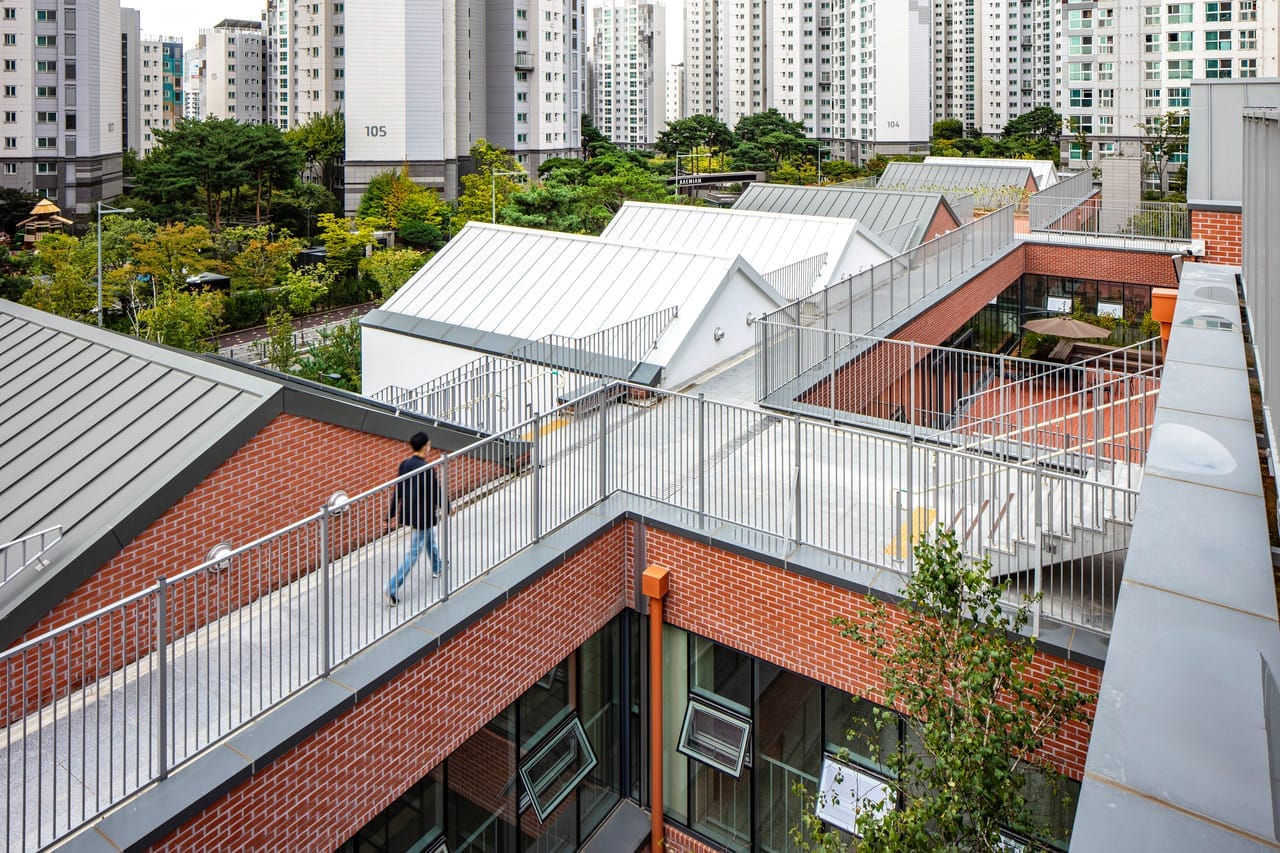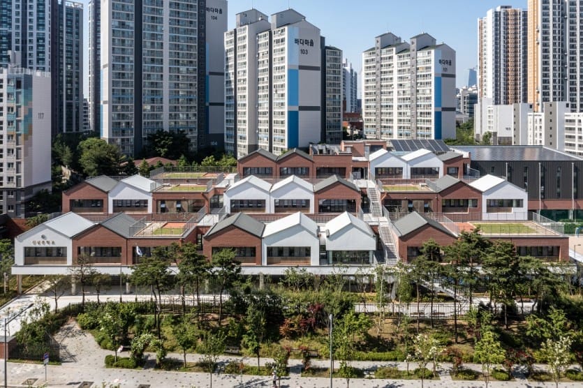 대규모 고층아파트 단지의 사이에 위치한 서울 영등포구의 신길중학교는 외관상 학교라고 보기에 어려운 형태의 디자인입니다. 여러 채로 나누어진 박공지붕과 듬성듬성 계획된 옥상정원은 도심 속 타운하우스와 같은 공동주택을 연상시킵니다. 고층, 고밀의 주변 환경과 대조적으로 낮은 ‘집’의 형태의 신길중학교는 마을을 다채롭게 만들며 학생과 주민에게 친근한 동네의 풍경을 제공하지요. 기존의 기계적으로 찍어낸 듯한 획일적인 학교건축에서 벗어난 신길중학교는 2021년 대한민국 공공건축상을 받으며, 그 가치를 인정받았습니다.