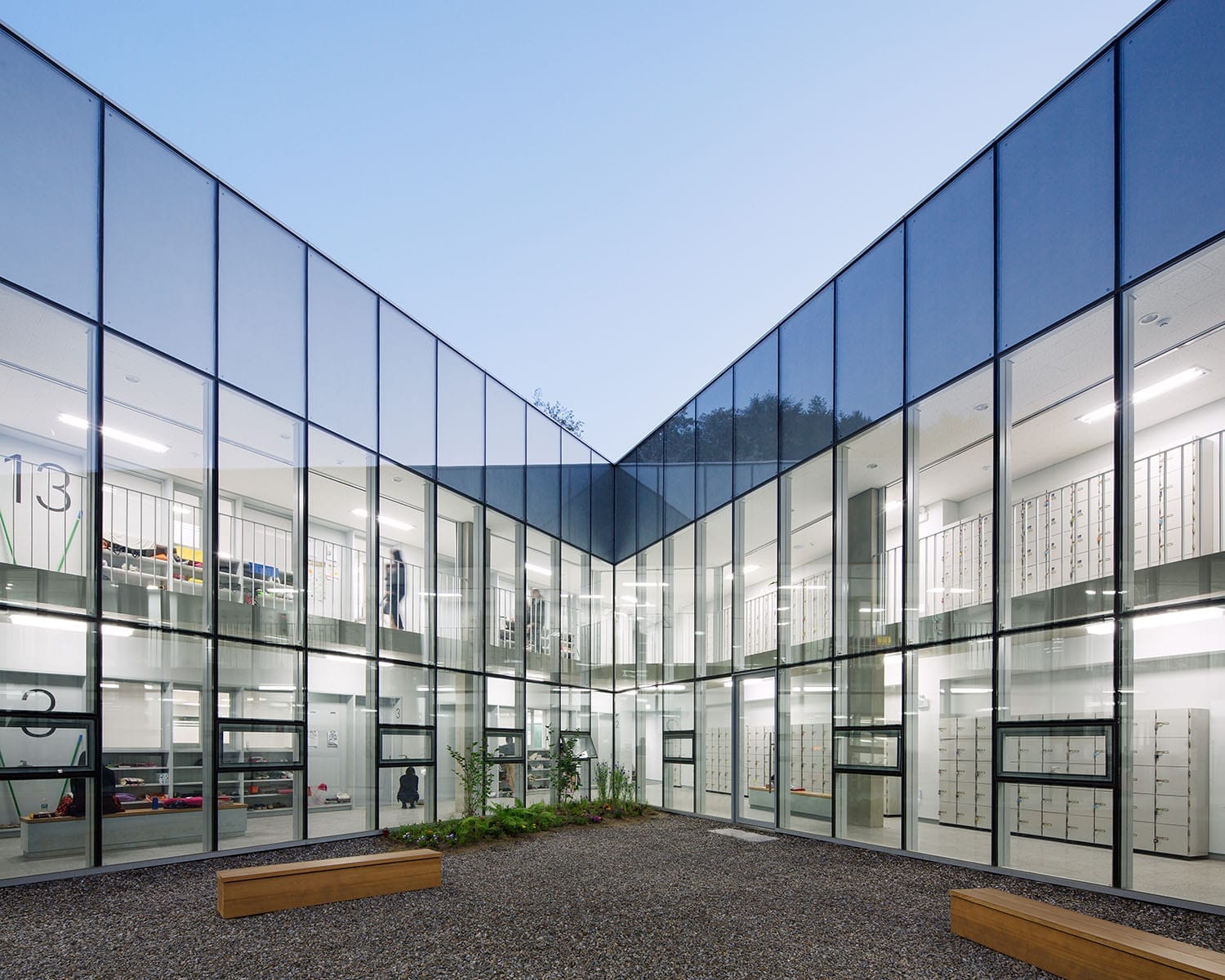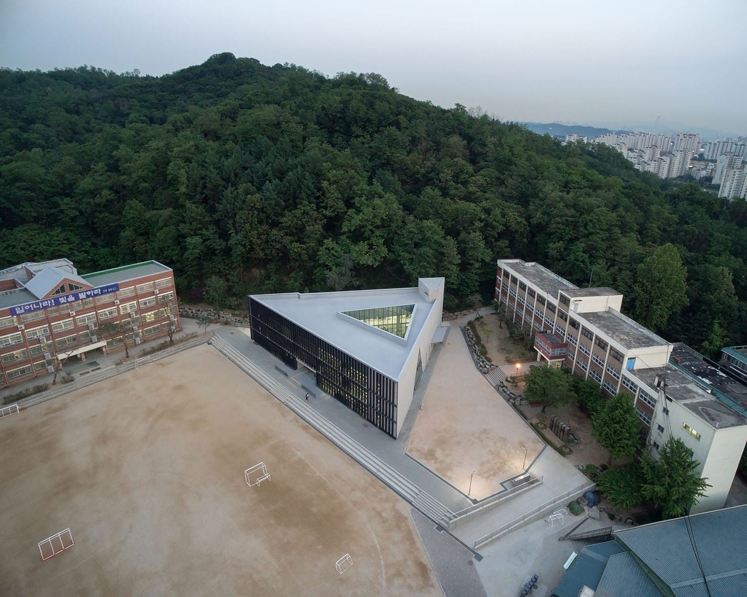 삼각형의 세 면은 주변의 운동장, 뒷산, 기존건물에 해당하는 세 가지의 맥락을 하나의 건물에 반영하는 형태로 작동합니다. 즉, 주변 환경에 대응하는 방식으로 세 가지의 서로 다른 입면을 구성한 셈이지요. 다양한 성격이 담겨있는 외부와 달리 내부의 중정에서는 통합된 공간을 통해 각 공간을 유기적으로 연결합니다. 중정을 통해 형성된 회랑과 같은 복도는 순환동선의 체계를 가지고 시각적인 교류를 가능하게 합니다. 이는 단순한 이동 목적의 동선이 아닌 다양한 이벤트를 일으키는 공간이 되기도 하지요.