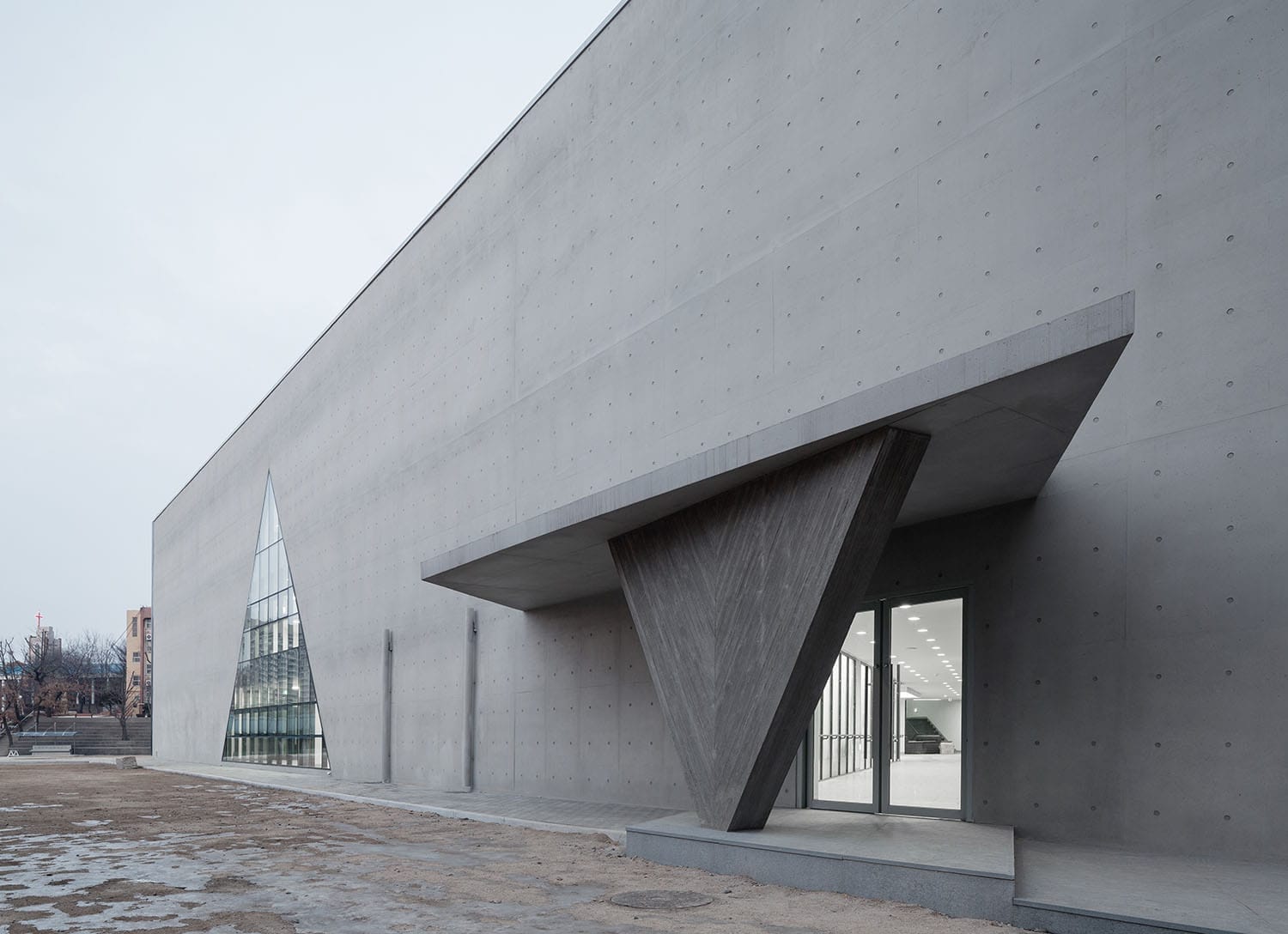 건물 이름에서부터 알 수 있듯이 삼각학교는 삼각형으로 이루어진 건물입니다. 남양주 동화고등학교에 지어진 이 건물의 정식 명칭은 송학관이지만 독특한 디자인으로 삼각학교로 알려졌지요. 네임리스 건축에서 설계를 맡았으며 2015년에 증축되어 무려 10년이 된 건물입니다. 삼각학교는 3학년 학생들의 교실과 교무실, 상담실 등이 있는 건물입니다. 무엇보다 건물 내부에 하늘을 향해 열린 중정을 두고 있는 것이 큰 특징이지요. 중정 역시 삼각형의 평면으로 계획되어 더욱 특별한 공간의 경험을 제공합니다. 일부 창호, 기둥에서 발견되는 삼각형의 기하학적 디자인은 해당 건물을 더욱 흥미롭게 만들어 주는 듯하지요.