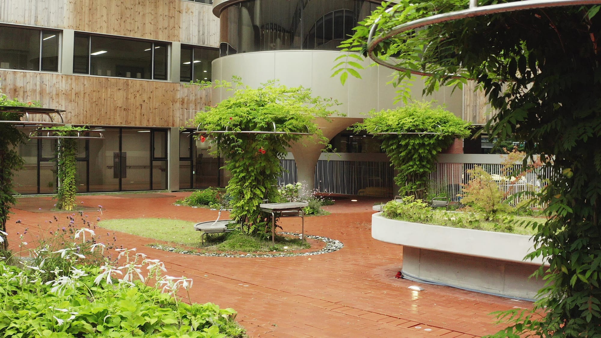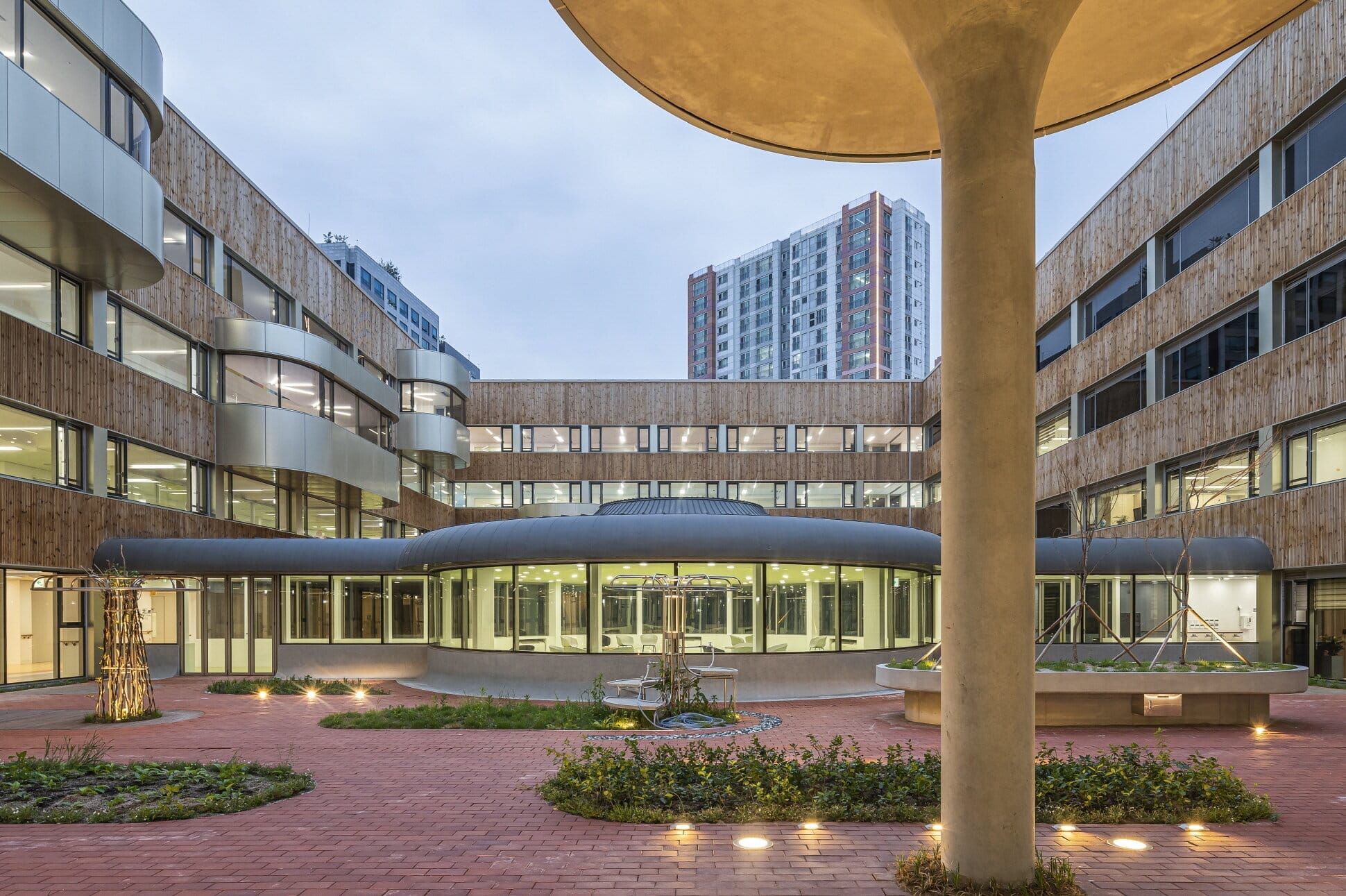 학교는 큰 중정을 형성하는 ‘ㅁ’자 배치를 취합니다. 그리고 중정에는 북카페가 계획되어 중정의 활용도를 높여 학생들의 외부활동을 자연스럽게 유도하지요. 해당 북카페와 중정은 교사, 학부모 등이 함께 사용하는 공간으로 학교의 중심적인 역할을 합니다. 이곳에서 학생들은 책을 읽고, 간단한 식사를 즐기기도 하는 공간으로 사용되고 있지요. 중정을 둘러싸는 순환형 복도는 일반 학교의 약 2배 넓이의 널찍한 폭과, 수직적으로는 2개 층이 오픈된 공간도 함께 계획되었습니다. 이러한 복도는 학생들의 안전한 활동을 가능하게 하며, 학년별로 교류할 수 있도록 도와주는 장치이지요. 또한, 중정에서 연결되는 외부 텃밭은 공동체 교육의 장의 역할을 합니다. 발달장애 학생들에 대한 세심한 배려와 고민이 자연스럽게 새로운 모습의 학교를 탄생시킨 셈이지요.
