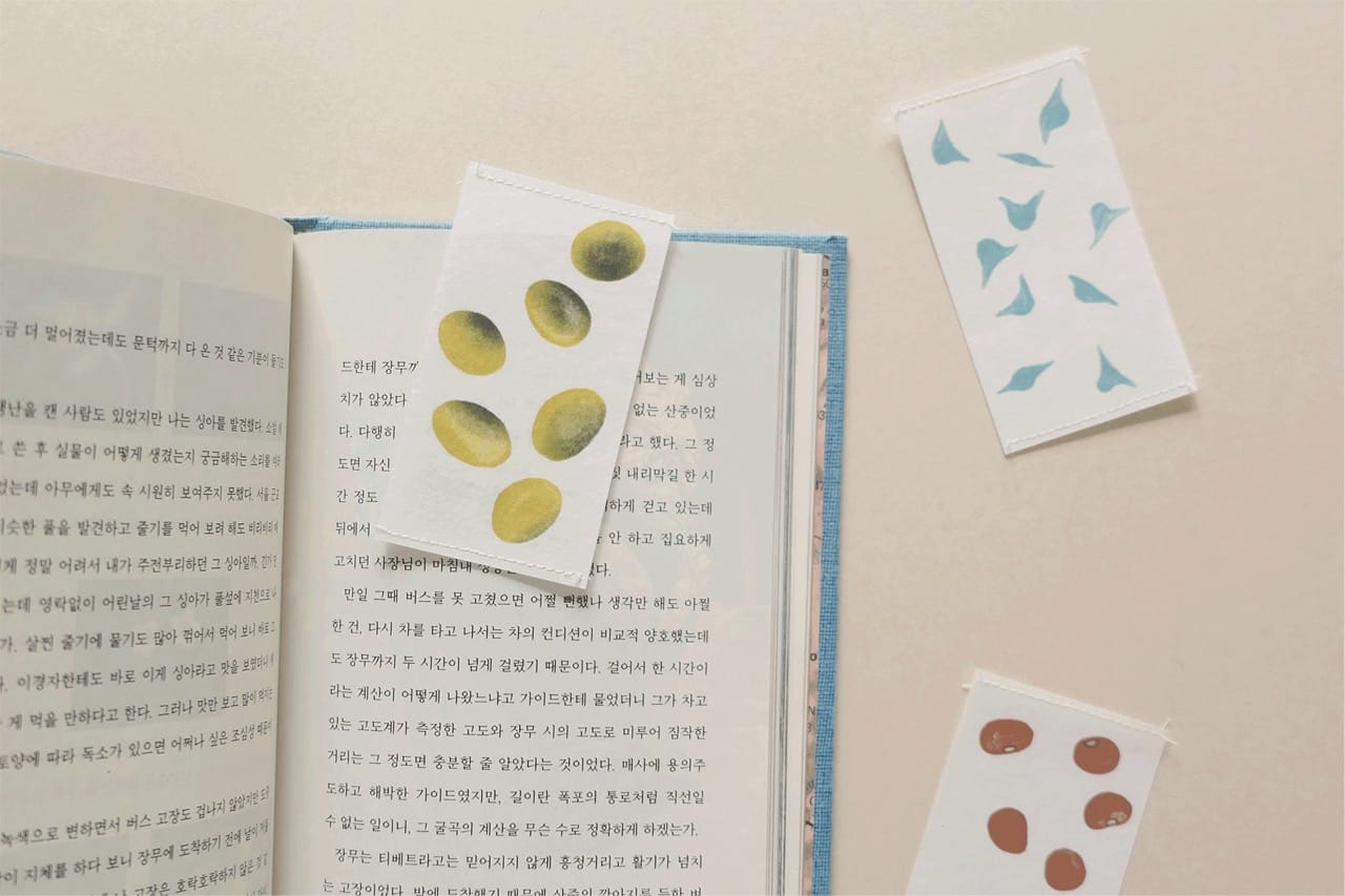 우리씨앗갈피는 박미루 작가가 선보이는 책갈피인데요. 드로잉부터 텍스트, 사진, 직물 등의 다양한 매체를 다루는 박미루 작가는 한국 토종 씨앗을 그림으로 표현했습니다. 선비잡이콩과 어금니동부, 뿔시금이라는 이름은 낯설지만 정겨움이 느껴지는 3개의 씨앗 일러스트가 한 장씩 그려져 있죠. 책갈피는 한지 위에 인쇄하고 스티치로 한 땀 한 땀 마감하여 책과 함께 두었을 때 자연스럽게 어우러지는데요. 뒷면 하단에는 이름의 유래부터 향과 맛, 파종 시기와 수확 시기 등을 소개하는 글이 적혀 있습니다.