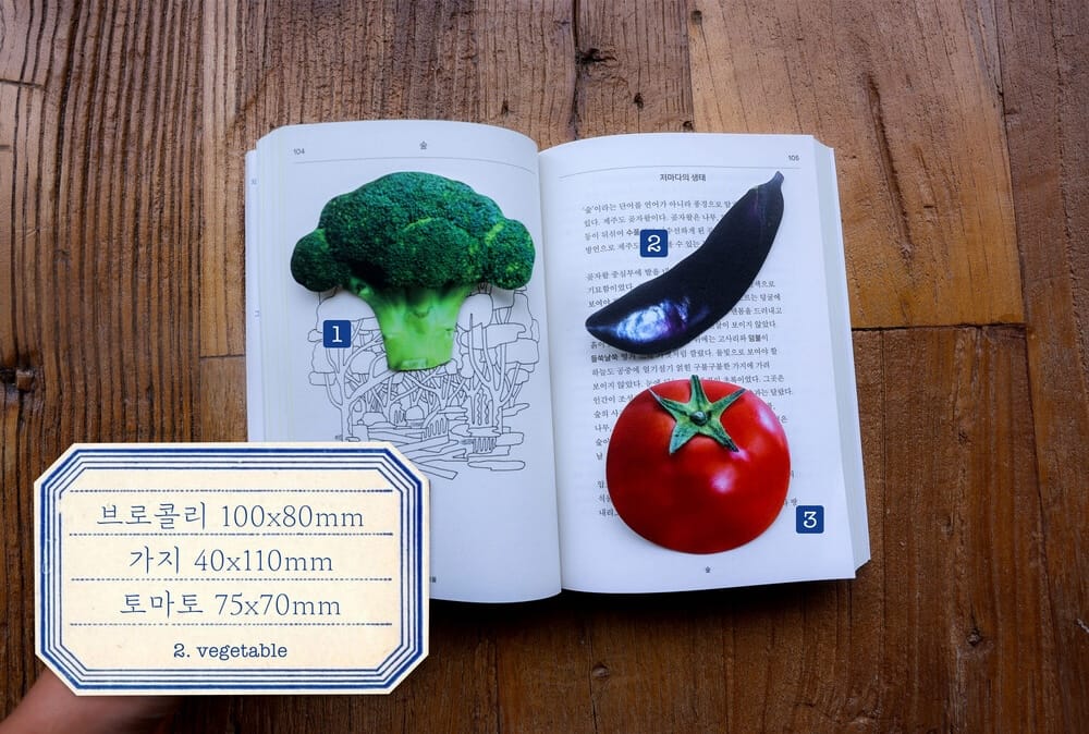 책갈피는 현재 3가지 종류로 만나볼 수 있는데요. 꽃 세트에는 봄이면 길을 걷다 쉽게 마주할 수 있는 하얀 철쭉과 팬지, 연 하늘빛 델피늄이 담겨 있습니다. 채소 세트에는 싱싱한 브로콜리와 토마토, 가지가 담겨 있으며 나무로 엮은 소쿠리 위에 몸을 웅크리고 잠이 든 고양이 세트까지 구매할 수 있죠. 손바닥 크기의 적당한 사이즈로 제작된 엽서는 심심한 벽을 알록달록 꾸며줄 인테리어 소품으로도, 활자로 빼곡한 흑백 세계 속에서 선명한 존재감을 드러내는 책갈피로도 손색없는 아이템입니다.