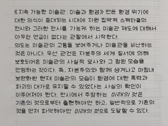 지금까지 살펴본 사례들은 모두 “전시도 지속 가능해야 한다”는 질문에서 출발합니다. 국내 기관들이 기후위기에 대응하기 위한 전시 방식을 고민하고 있다는 점은 고무적입니다. 그러나 일부 기관의 실천에 머물 것이 아니라, 문화예술계 전반에 걸쳐 ‘지속 가능성’을 중심 가치로 삼는 전환이 절실한 때입니다.