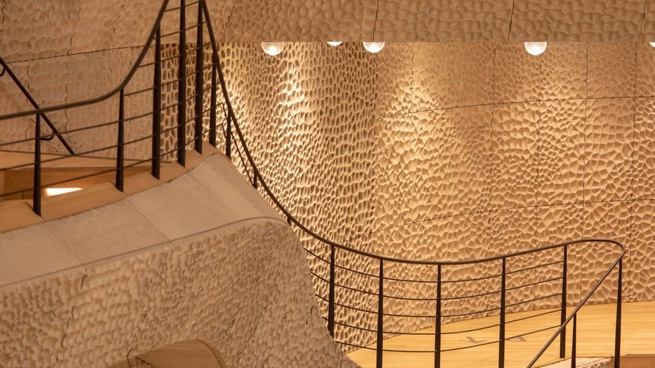 건물의 핵심 공간인 그레이트 홀(Großer Saal)은 하부의 적벽돌 창고와 완전히 분리된 이중 구조의 이 공간입니다. 외부 진동과 소음을 차단하는 데 특화된 ‘무진동 설계’로 이루어졌는데요. 철도와 항만 트럭이 지나가더라도 완전한 침묵 속에 공연을 감상할 수 있는 곳이죠. 공연장은 무대를 중심으로 객석이 계단식으로 둘러싸인 ‘빈야드(vineyard)’ 구조로, 2,000석 규모의 홀 어디에 있더라도 연주를 감상할 수 있도록 설계되어 공연장의 공간감에 웅장함을 더합니다.