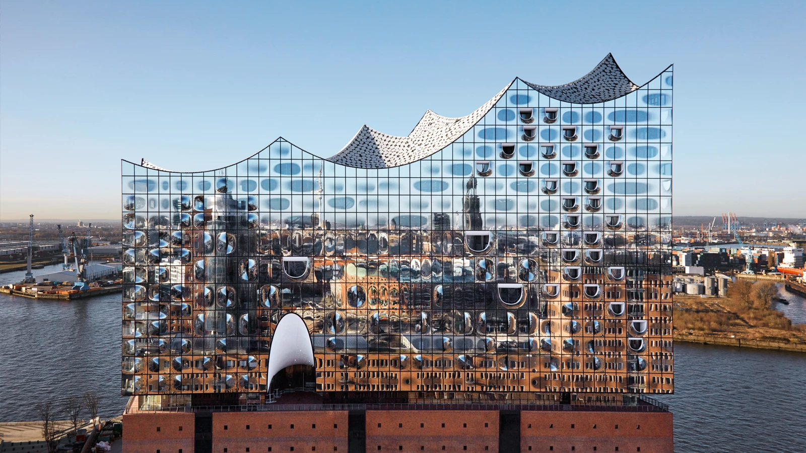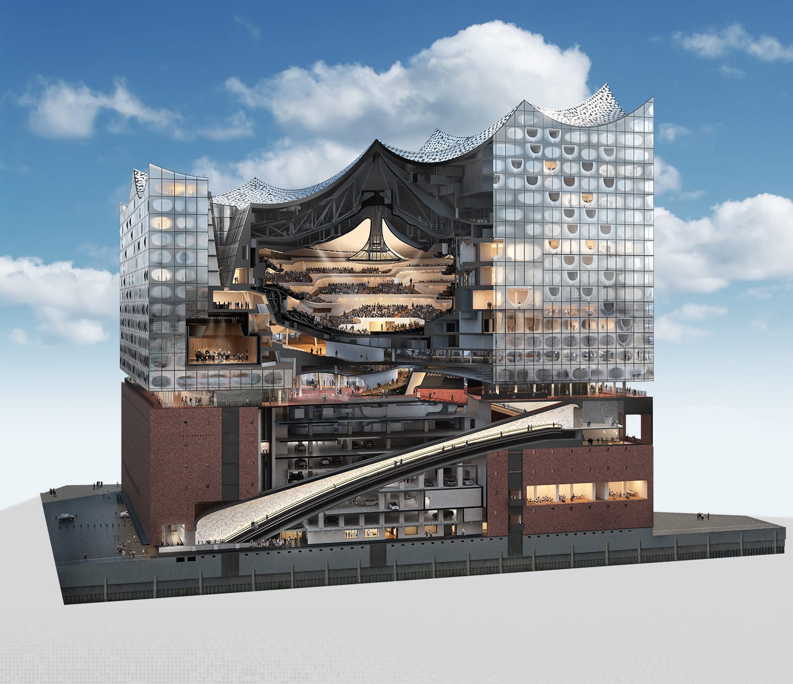 엘프필하모니는 형태와 기능이 극적으로 통합을 이룬 곳입니다. 과거 적벽돌 창고였던 하부 구조는 20세기 산업의 상징이자 하펜시티의 과거를 상징하는 구조로, 로비, 주차장, 물류, 백오피스 공간으로 활용됩니다. 그 위에 증축된 상부 구조는 최첨단 음향 설계를 바탕으로 건축된 콘서트홀과 함부르크 시내 전체가 내려다보이는 전망대이자 플라자(Plaza)로 운영되고 있고요.