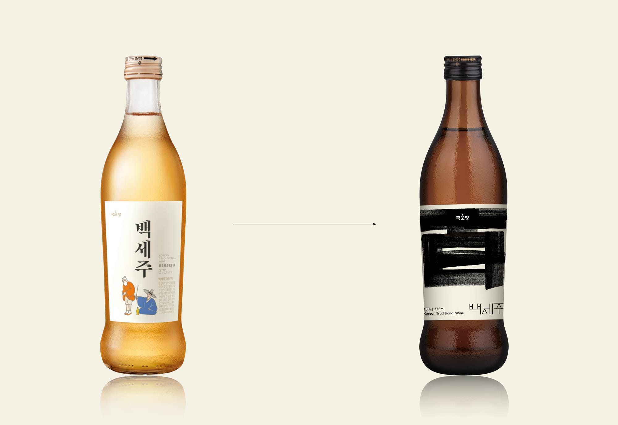 이미 망가진 판을 뒤집는 것, 혹은 어떠한 기반 없이 바닥부터 쌓아 올리는 것보다 어려운 일은 이미 잘 다져진 과거를 뒤로하고 변화를 택하는 것이죠. ‘백세주’는 2020년 개편에 이어 4년 만에 전격 리브랜딩을 택했습니다. 32년간 이어진 백세주의 이미지를 포용하면서도, 앞으로 나아갈 시간을 기대하며 ‘백 년을 잇는 향기’라는 슬로건을 내걸었죠. 대중에게도 널리 알려진 전통 청주의 정체성을 뒤엎는 과제는 마켓 컬리, 당근 등의 브랜드 디자인을 제작한 CFC가 맡았습니다. CFC는 SM 엔터테인먼트, 예스24, 칠성사이다 등 브랜드의 새 출발을 여럿 담당한 만큼, 백세주의 도전적인 변화를 잘 담아낼 적격자였죠. 2024년 백세주의 리브랜딩은 잔나비의 최정훈이 앰버서더를 맡고 <아기공룡 둘리> 속 고길동의 서사를 담아낸 감동적인 광고로 주목을 받기도 했지만, 리브랜딩을 이끌어간 핵심은 단연 CFC가 구성한 브랜드 정체성과 디자인에 있습니다.