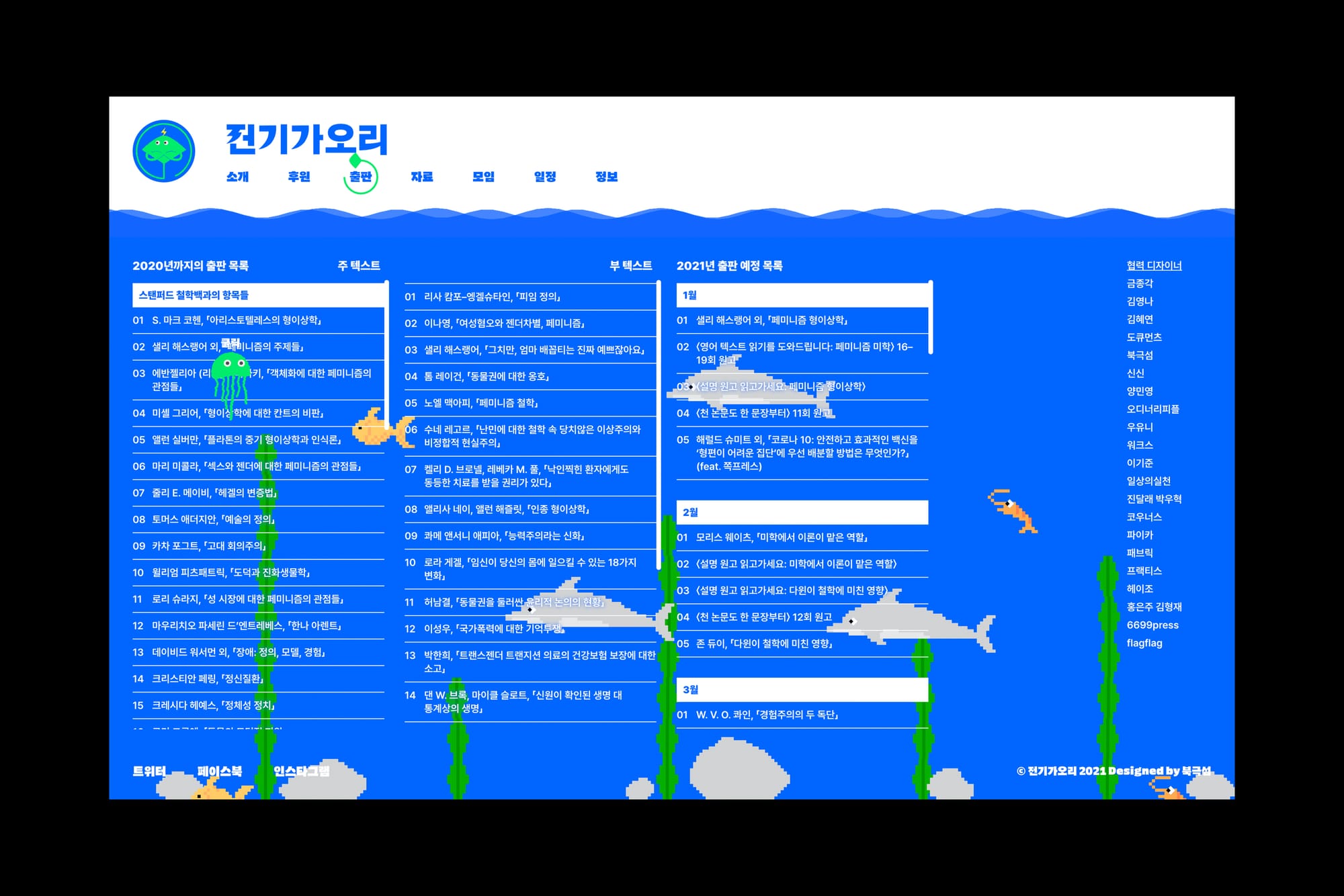 그리고 전기가오리의 로고를 제작한 북극섬(김재하)의 디자인도 눈여겨봐야 합니다. 쨍한 초록색과 파란색을 조합한 아이덴티티 로고는 ‘철학 학문 공동체’라는 진중한 이미지에 휘둘리지 않는 전기가오리의 독특한 행보를 연상케하죠. 무엇보다 ‘가오리’라는 핵심 캐릭터는 깊고도 넓은 철학이란 학문의 이미지를 바다의 그것으로 연결합니다. 홈페이지를 부유하는 귀여운 모습의 가오리와 해파리 캐릭터는 전기가오리와 함께하는 구성원들이 철학의 바다를 방황하지 않도록 돕는 길잡이처럼 든든하게 느껴지기도 하죠.