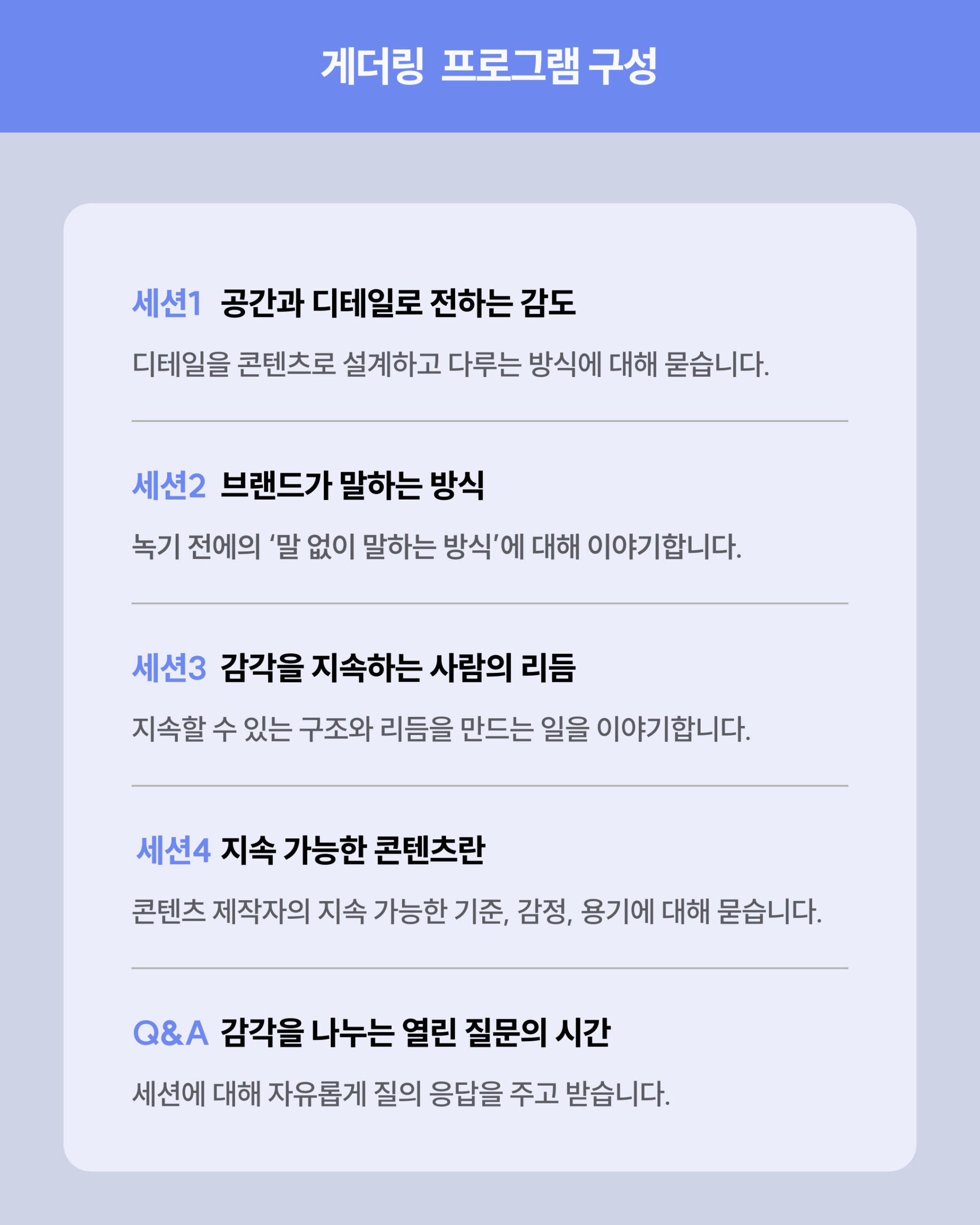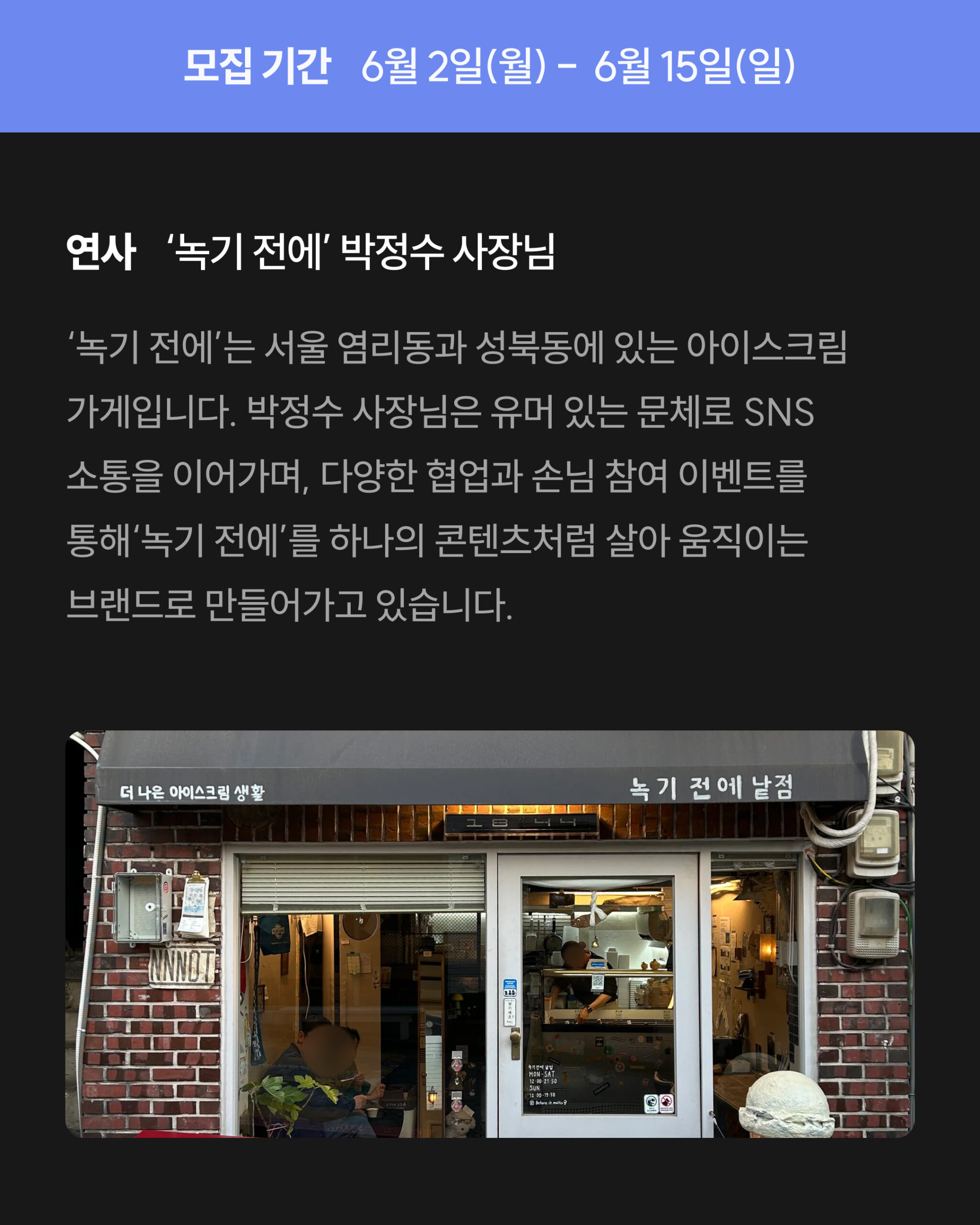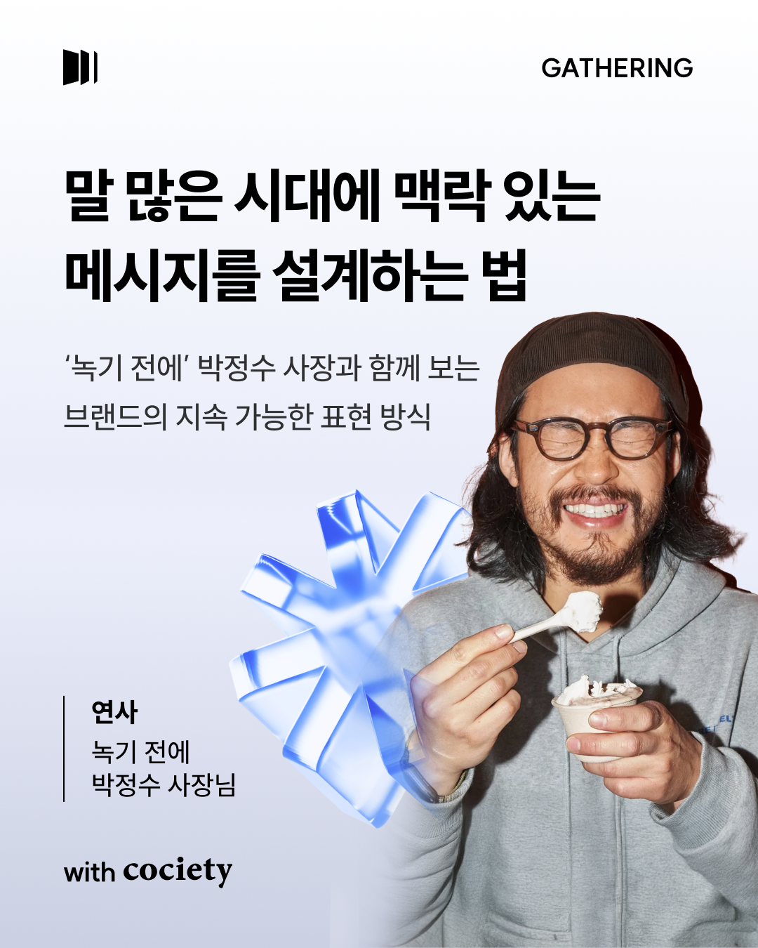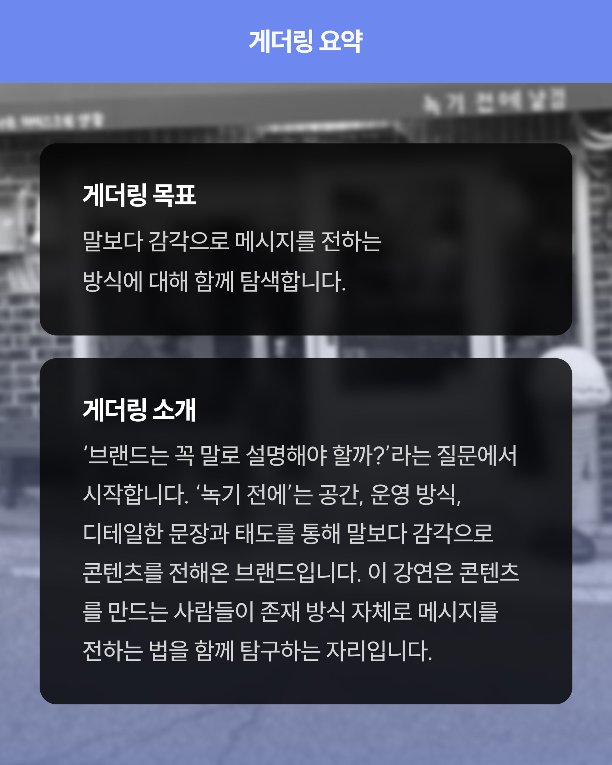 '브랜드는 꼭 말로 설명해야 할까?’라는 질문에서 시작합니다. ‘녹기 전에’는 공간, 운영 방식, 디테일한 문장과 태도를 통해 말보다 감각으로 콘텐츠를 전해온 브랜드입니다. 이 강연은 콘텐츠를 만드는 사람들이 존재 방식 자체로 메시지를 전하는 법을 함께 탐구하는 자리입니다.