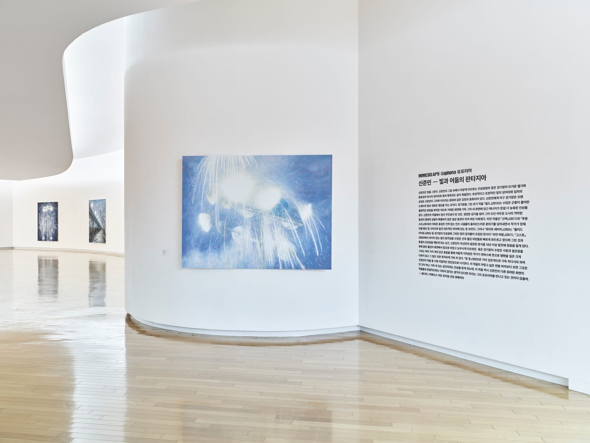 신준민의 회화에는 어둠 사이로 밝게 튀어 오르는 빛이 등장한다. 그 빛이 야구장의 조명에서 발하는지, 유원지의 일루미네이션에서 발생하는지는 그다지 중요하지 않게 느껴진다. 어둠 사이에서 강렬한 인공 빛을 마주했을 때 우리가 느끼는 시각적 경험과 그 경험이 만들어내는 감상, 이렇게 밝은 조명이 밤에 도래하기 전에는 경험할 수 없었던 눈부심이 신준민의 작업을 관통하는 하나의 주제가 된다. 신준민의 회화는 일정한 강도로 느긋하게 우리를 비추는 것이 아니라 순간적으로 폭발하며 이내 사라질 인공 빛을 우리 앞으로 가져다 놓는다. 그의 회화가 가장 밝고 강렬한 순간을 포착하고 있음에도 뜻 모를 애석함을 남기는 이유가 거기에 있을지도 모른다. 우리는 이제 금방 휘발되고 마는 빛무리에 너무나도 익숙하다. 어둑어둑한 거리 위 전광판에 등장하는 아름다운 상품들의 모습도, 크리스마스 백화점 벽 위 미디어 월의 환상적인 이미지도 순간적으로 우리 눈을 사로잡을 뿐 순식간에 그들은 사라진다. 스마트폰 화면 위로 밝게 빛나는 이미지가 작은 버튼 하나를 누르는 순간 검게 변해버리는 것을 매일매일 경험하는 우리는 빛의 이미지가 얼마나 쉽게 사라지는지를 잘 알고 있다. 신준민의 회화는 그 틈을 노린다. 이 빛이 곧 사라지리라는 것을 무의식적으로 깨닫고 애수를 느끼는 순간을 파고든다. 그가 포착하는 이미지는 분명 손 위의 스마트폰 이미지를 닮은 인공의 빛이지만, 그는 그것을 회화로 포착하기에 우리의 예상을 뒤엎고 꺼지지 않는다. 스마트폰 위 디지털 이미지가 남긴 상실은 다시 손짓 한 번에 다른 이미지로 대체되고 그 애수마저 금방 다른 것으로 대체되고 말지만, 신준민의 강렬한 빛은 어떻게 해도 꺼지지 않는 채로 꺼지고 말 순간을 영원한 예측의 상태로 밀어 넣는다.