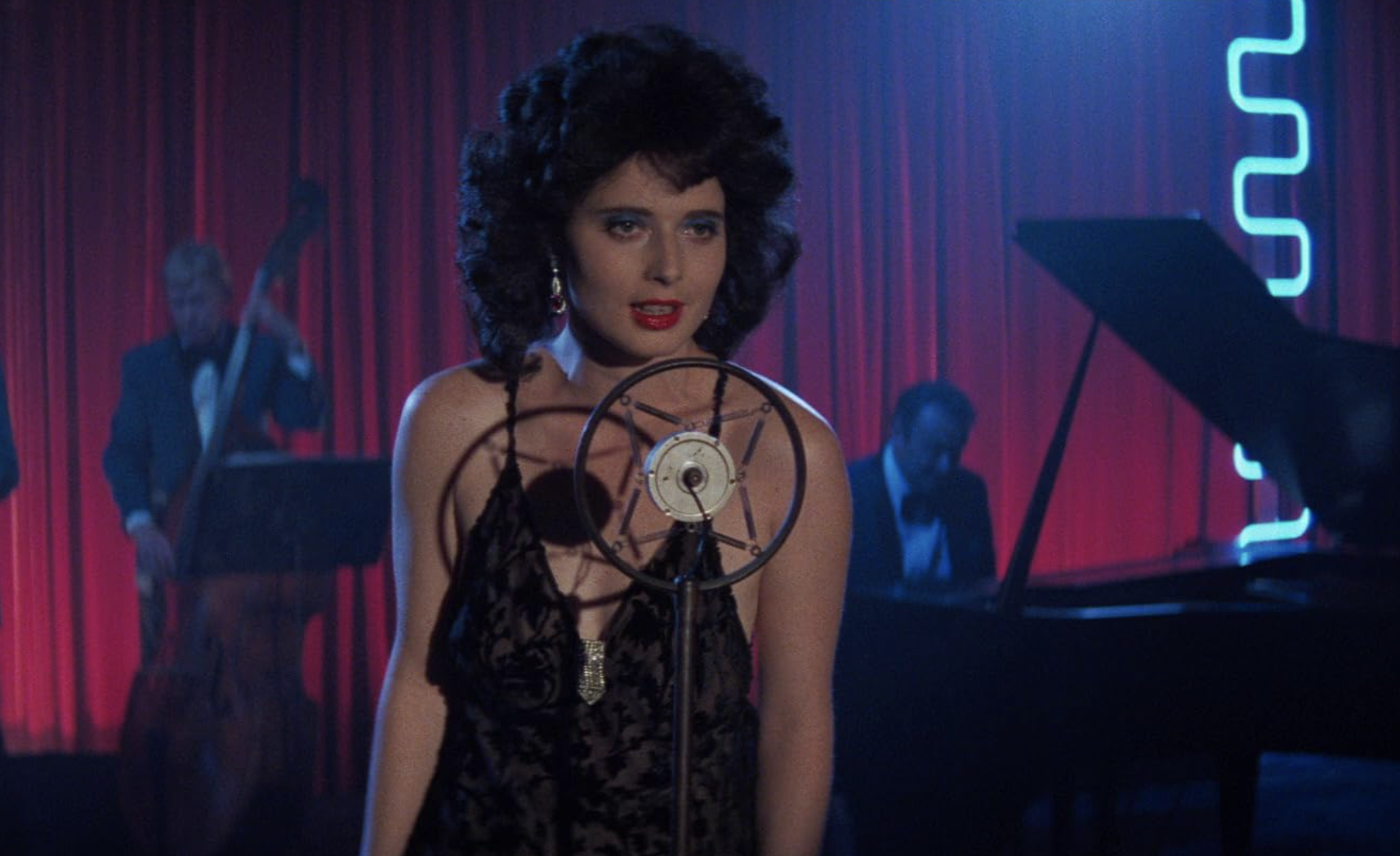 특히 인물의 내면은 청각적으로 대변되곤 하는데요. 주인공 제프리는 알 수 없는 이끌림에 살인사건의 용의자로 의심받는 여가수를 염탐하러 찾아가고, 위기에 몰려 비좁고 어두운 실내에 몸을 숨기게 됩니다. 이후로도 도로시의 아파트를 찾아가는 행위는 좁은 공간에 갇히는 느낌을 동반합니다. 이에 시선은 정적인 공간을 답답하게 따라가지만, 사운드는 간헐적인 도로시의 노래 혹은 비명이나 오열, 외부의 일상 소음이 교차되며 불안을 증폭합니다. 정체불명의 남자 프랭크의 등장 역시 같은 맥락으로 연출됩니다. 깔끔하게 차려입은 정제된 모습으로 등장하지만 곧 거친 숨소리·헐떡임·금속성 노이즈·욕설이 화면을 장악합니다. 비상식적인 기준이 있는 듯한 몸짓은 귀를 괴롭히는 폭력적 소리와 만나 ‘이 인물은 통제 불능의 광기 그 자체’임을 알립니다.