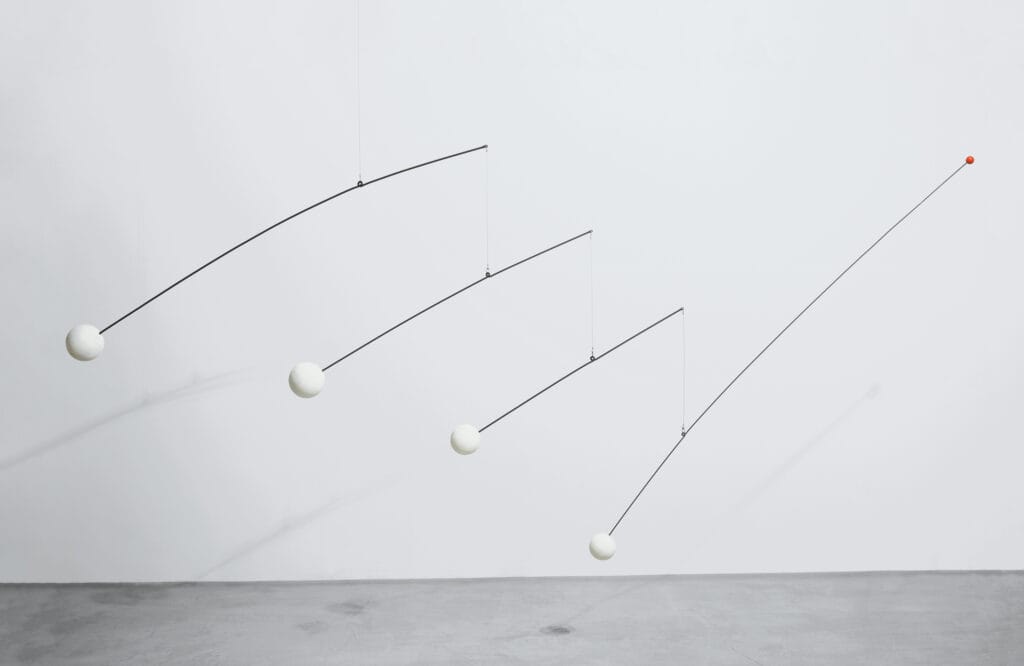 모빌의 기원은 꽤 명확하게 알려져 있습니다. 1932년 알렉산더 칼더(Alexander Calder)가 만든 움직이는 추상 조각이 모빌의 시초로 여겨집니다. 마르셀 뒤샹(Marcel Duchamp)이 칼더의 스튜디오에 방문해 작품을 보고 프랑스어로 움직인다는 뜻의 ‘모빌(mobile)’이라고 불렀던 것이죠. 공중에서 균형을 잡는 조각 작품은 그 이전에도 존재했지만, 그러한 작품군을 두고 모빌이라고 부르기 시작한 것은 칼더의 작품이 처음이었어요.