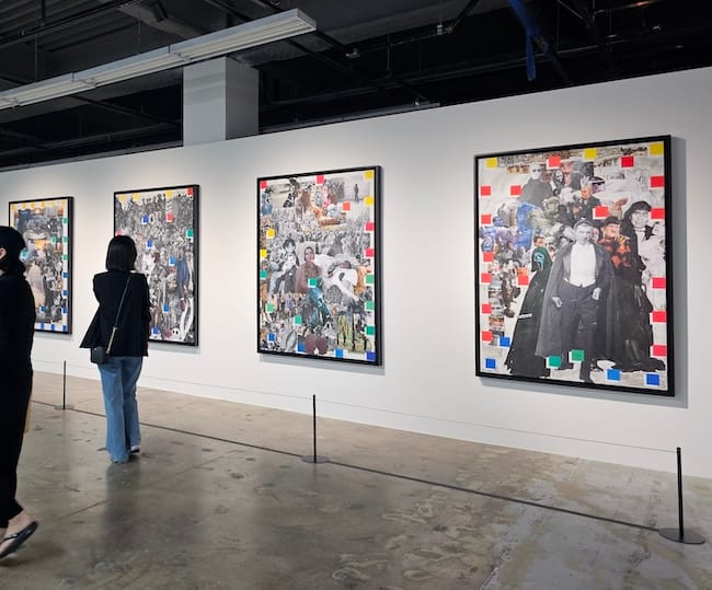 그런데 윌리엄스의 콜라주에는 우리의 읽기를 당혹스럽게 만드는 지점이 하나 존재한다. 바로 화면 위를 떠도는 여러 색점들이다. 작품 안을 가득 채운 빽빽한 얼굴들을 읽어가다 우리는 문득 그 주위에 부유하는 색점들을 발견하는데, 색점이 발생시키는 파열과 정지의 지점에서 이들이 존재하는 공간이 단순히 가상의 백지, 타블로 라사가 아니라 디지털 화면이나 인쇄물 안이라는 것을 깨닫는다. 그렇다면 과연 우리가 보고 있는 것은 실재인가 아니면 허구인가?
