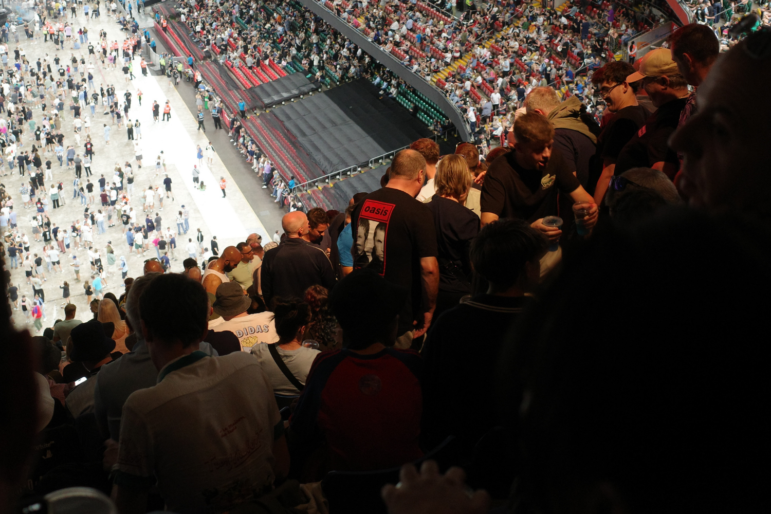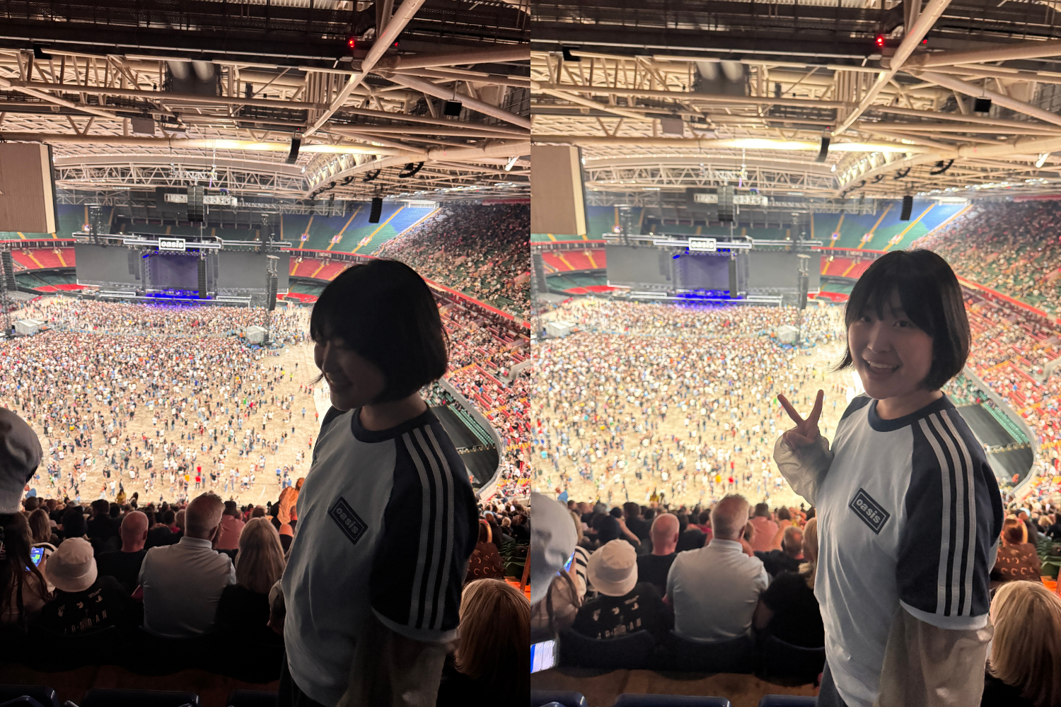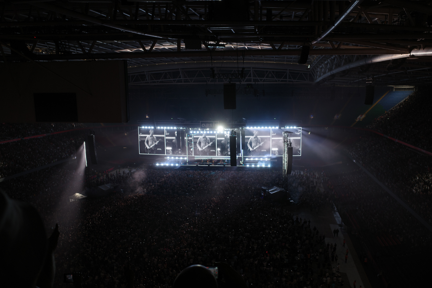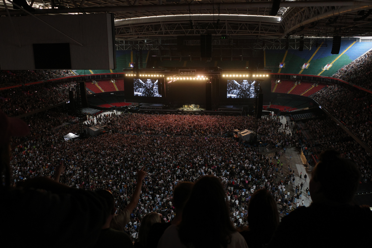 우리는 공연 전 스테이지에서 펼쳐질 또 다른 공연을 위해 입장 시작 직후 공연장에 들어섰습니다. 좌석은 말 그대로 ‘하나님 석’, 즉 무대보다 하늘에 가까웠는데요. 약 1초간 실망했지만 큰 문제가 되지 않았습니다. 이제 곧 저 무대에 오아시스가 오른다는데, 내 록스타와 같은 공간에 존재하게 된다는데 그것이 대수겠어요! 공연장은 카디프 프린시팔리티 스타디움으로, 약 7만 3천여 명을 수용할 수 있는 럭비 경기장이었습니다. 이렇게 큰 규모의 스타디움은 또 처음이라 신기한 마음에 그 풍경을 바쁘게 눈에 담았습니다.