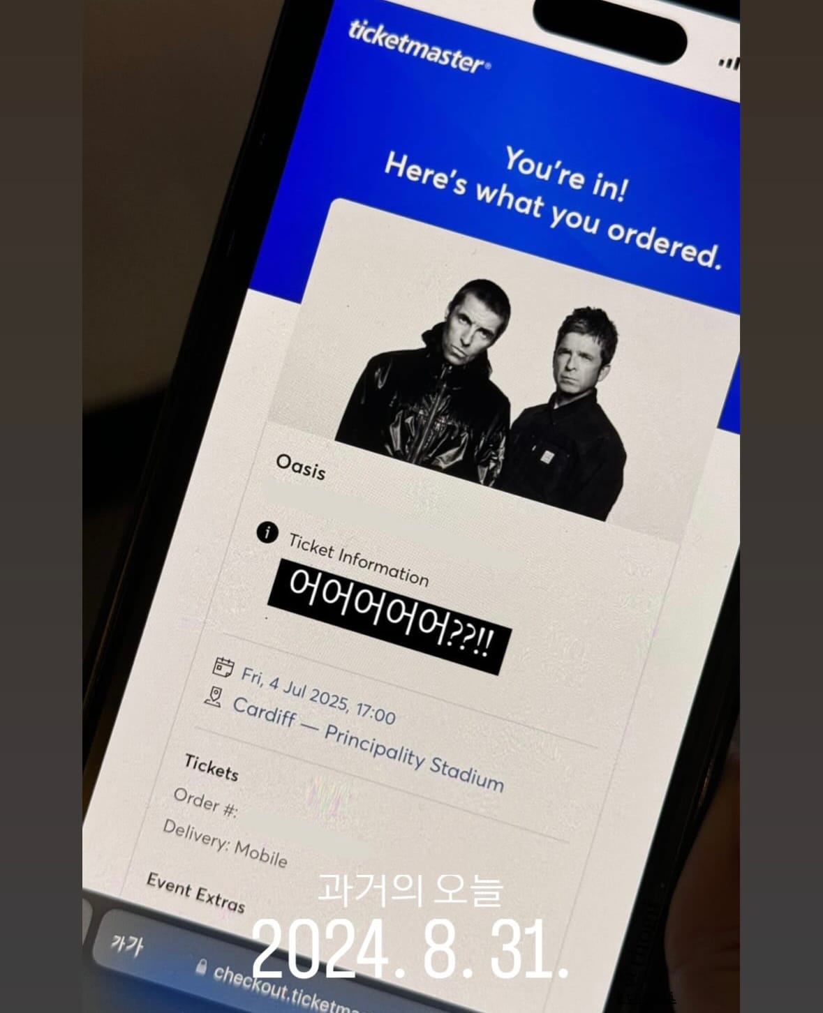 의미 부여가 결코 과한 건 아니었습니다. 얼떨결에 예매한 공연이 오아시스 모든 투어의 첫 공연이었기 때문이죠. 당시 경쟁이 가장 덜 치열한 지역은 어디일지 고민하던 저와 친구는 서너 가지 지역 예매 창을 동시에 공략했는데요. 결국 성공했던 게 웨일스 지역 카디프에서 펼쳐질 첫 공연이었습니다. 2009년 해체 이후 역사적인 재결합 투어, 그 신호탄인 첫날 오아시스와 함께하게 된 셈이죠. 이걸 어떻게 포기할 수 있겠어요?