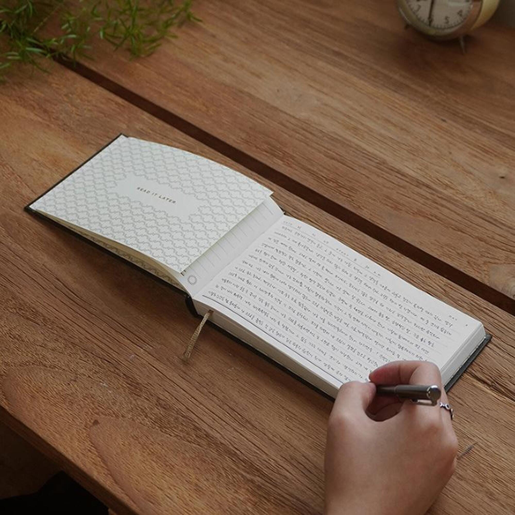 저는 ‘예쁜 물건’ 만능주의입니다. 일상에 예쁜 물건을 들이는 것이 많은 문제를 해결한다고 믿어요. 이것이 예쁜 일기장을 들이는 게 생각보다 중요한 이유입니다. 일기를 꾸준히 쓰고 싶다면 우선 내 취향의 일기장을 찾으세요. 시간을 들여 고급 문구점, 소품 가게에 가거나 쇼핑 플랫폼을 뒤지는 수고는 필수적입니다. 집에 굴러다니는 아무 노트에나 내 일상을 털어놓을 순 없죠. 저는 지금 포인트오브뷰에서 구매한 노트에 일기를 쓰고 있습니다. 질 좋은 문구가 필요할 때마다 들르는 곳이에요. 이전엔 3년 다이어리라고, 3년간 쓰는 일기장을 사용하기도 했는데요. 작년과 재작년의 같은 날짜에 내가 뭘 했는지를 같이 아카이빙해가는 재미가 쏠쏠해요. 일기를 처음 쓰는 분께 특히 추천하는 방식입니다. ‘3년 일기장’이라고 검색하시면 여러 제품이 나오는데 저는 일본 ‘미도리’ 문구사의 것을 사용했습니다.