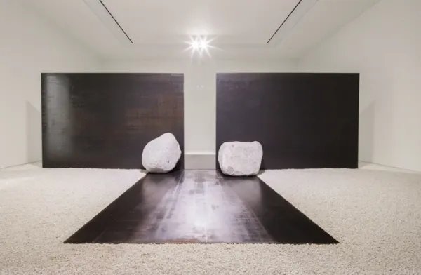 이우환 작가의 작품을 처음 마주하면 조금 당혹스럽기도 합니다. <관계성> 시리즈라는 설치 작품은 특히 그렇죠. 거대한 바위와 철판이 덩그러니 마주 놓여 있는가 하면, 충격으로 금이 간 유리 위에 커다란 바위가 놓여있기도 합니다. 학부 시절, 이우환 작가의 가상 전시 브랜딩을 주제로 했던 졸업 전시를 위해 부산에 있는 이우환 공간에서 그의 설치 작품을 처음 마주했습니다. 앞 뒷면을 맞대고 버티는 바위 덕분에 곧게 세워진 두 개의 철판 사이를 걸어지나가면서 생경한 기분을 느낄 수 있었어요. 철판으로 된 문을 지나 새로운 세계가 열리는 듯한 감각이었죠.