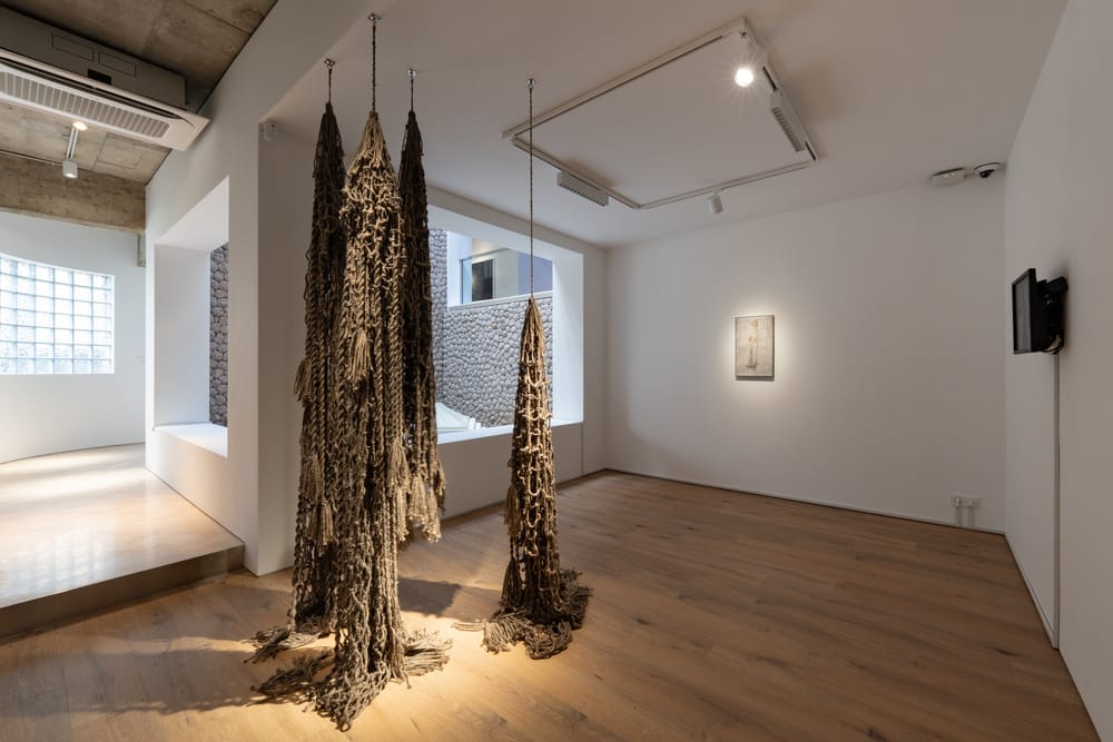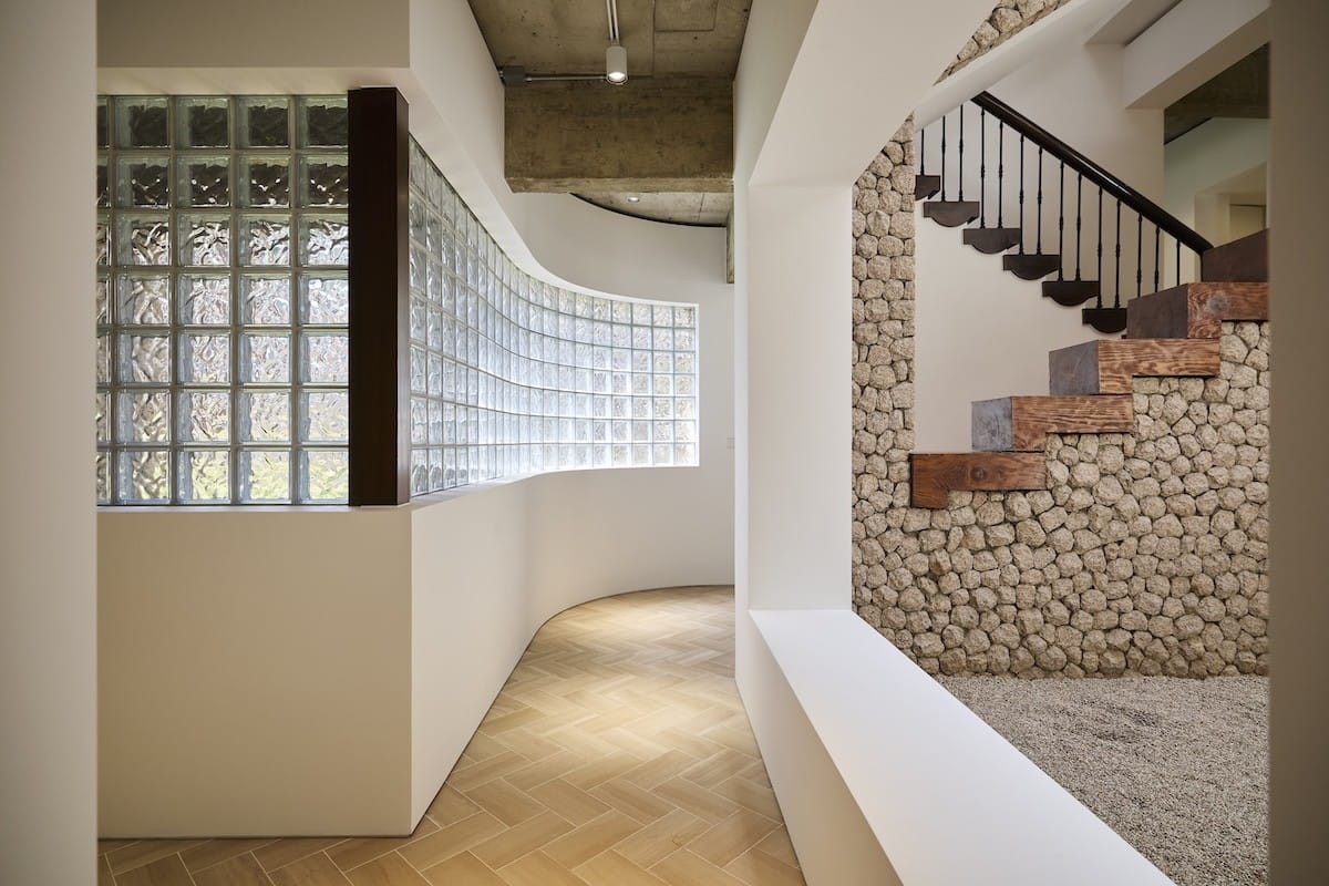 둥글게 마감된 화강암 벽과 정제된 목재 계단, 헤링본 타일 바닥, 그리고 중앙부의 높은 천장이 만들어내는 중정 속에서 작품들은 각각의 맥락과 메시지를 지닌 채 내부 공간에 자연스럽게 녹아듭니다. 개방된 구조는 각 공간을 구획하면서도 유기적으로 이어져 있어, 관람자는 계단을 오르내리며 다양한 각도에서 작품을 감상할 수 있죠. 특히 전시 공간에서는 보기 드문 유리 블록 창이 자연광을 조절하면서 작품을 보호하고, 동시에 이곳이 ‘가정집’이었다는 감각을 넌지시 환기합니다.