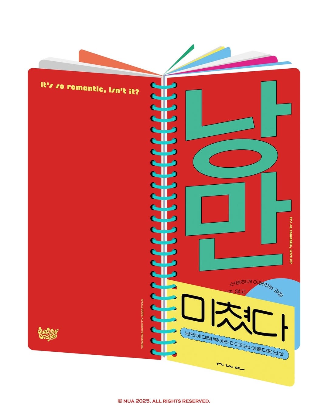 일러스트레이터 누아(NUA)는 알록달록하고 다채로운 색감으로 밝고 경쾌한 에너지를 전달합니다. 이번 퍼블리셔스 테이블에서 공개한 신간 『낭만 미쳤다』는 미술과 음악의 만남이라는 색다른 기획이 돋보이는데요. 세로로 긴 판형과 눈길을 사로잡는 붉은 표지, 통통 튀는 민트색 링 제본에 반짝이는 유광 재질의 종이까지. 기성 출판에서는 볼 수 없는 실험적인 요소가 인상적이죠. 이번 신간에서 누아 작가는 글을 비롯해 그림과 사진으로, 뮤지션 서윤혁은 음악으로 참여했는데요. 내지의 QR코드를 인식하면 이 책을 위해 작곡된 음악 세곡을 감상할 수 있습니다.