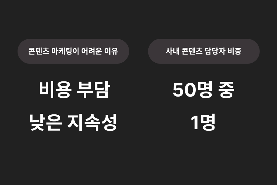 콘텐츠 마케팅이 중요하다는 건 이제 누구나 압니다. 당장의 구매 전환으로 이어지지 않더라도, 장기적인 관점에서 흔들리지 않는 브랜드 팬덤을 구축하려면 필수적이죠. 문제는 비용과 지속성입니다. 에이전시에 맡기자니 비용이 부담스럽고, 마케터를 새로 뽑자니 조직 내부에서 이들을 체계적으로 지원하고 받쳐줄 시스템이 없습니다.