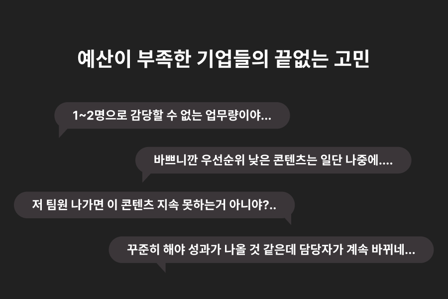콘텐츠 마케팅은 중요하지만, 시작이 어렵습니다. 에이전시는 비용이 부담스럽고, 인하우스 채용은 고정비 리스크가 큽니다. 한 명의 마케터가 모든 것을 책임지기에는 업무 범위가 너무 넓고, 담당자가 바뀌면 쌓아온 것들이 무너집니다. 예산은 언제나 부족하고, 지속 가능한 시스템을 구축하기란 쉽지 않습니다. 이것이 많은 기업이 콘텐츠 마케팅 앞에서 멈칫거리는 이유입니다.