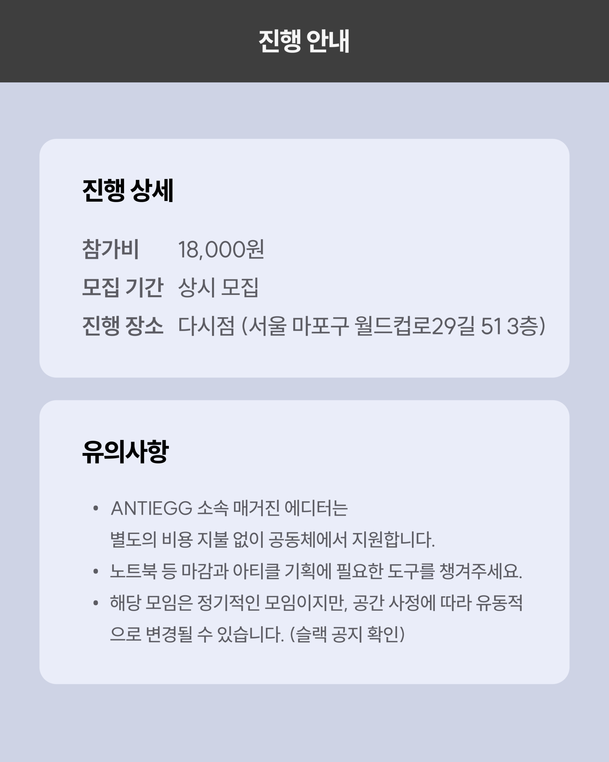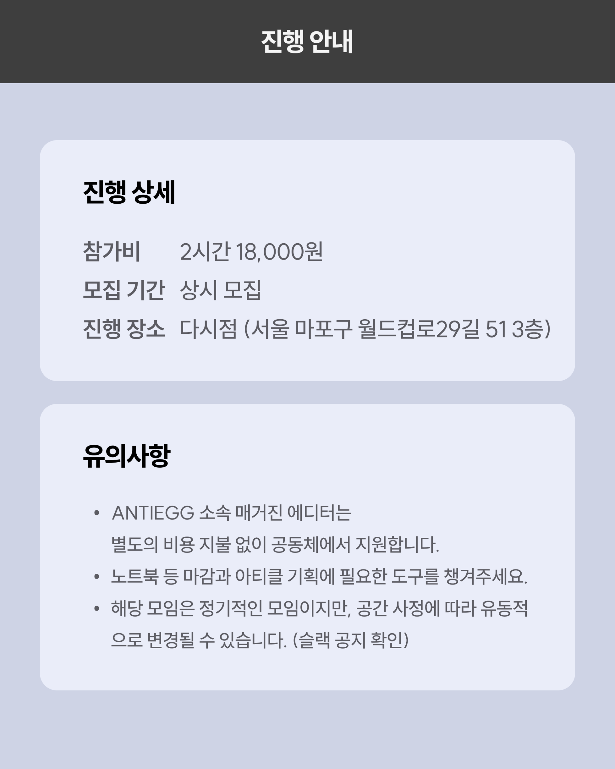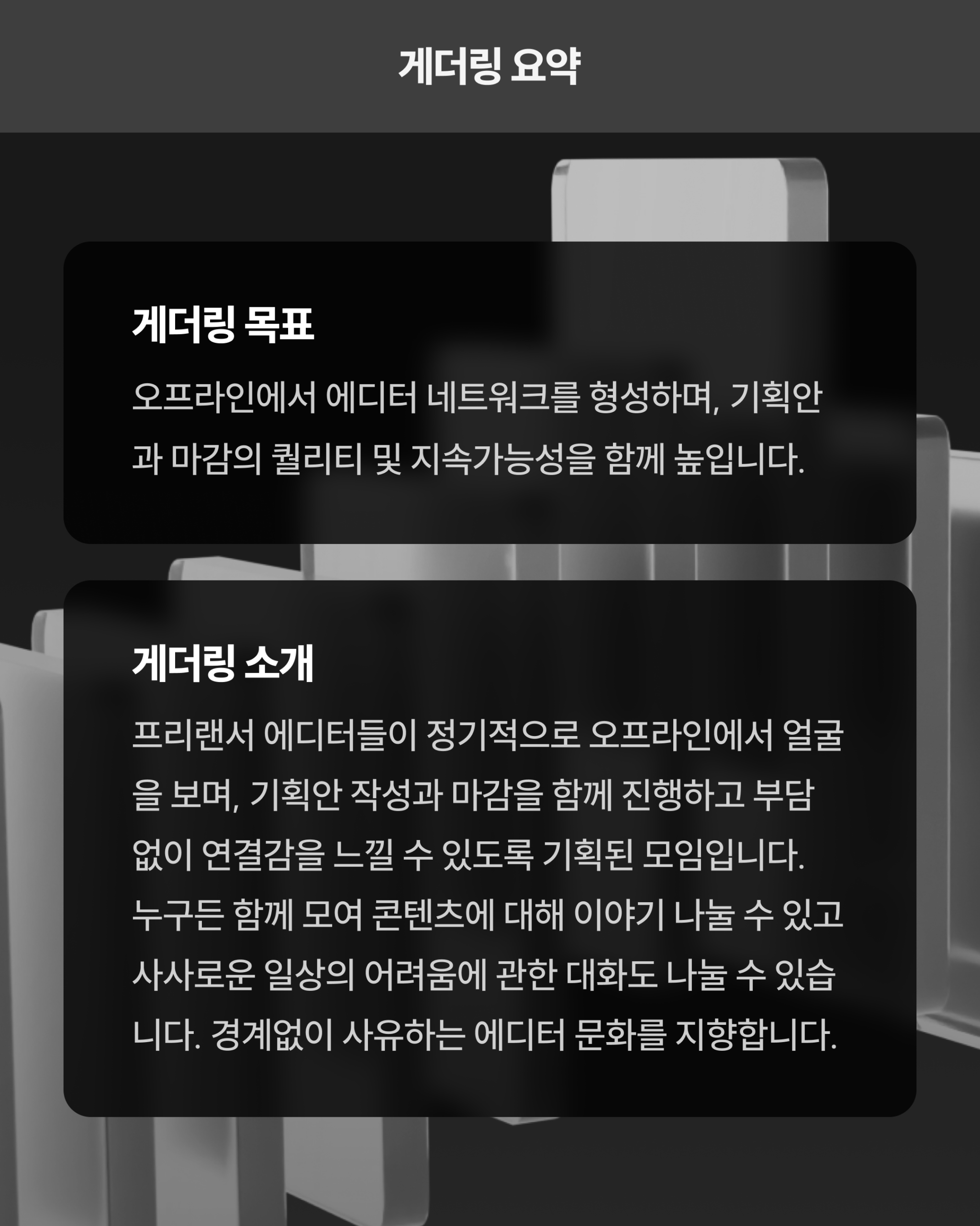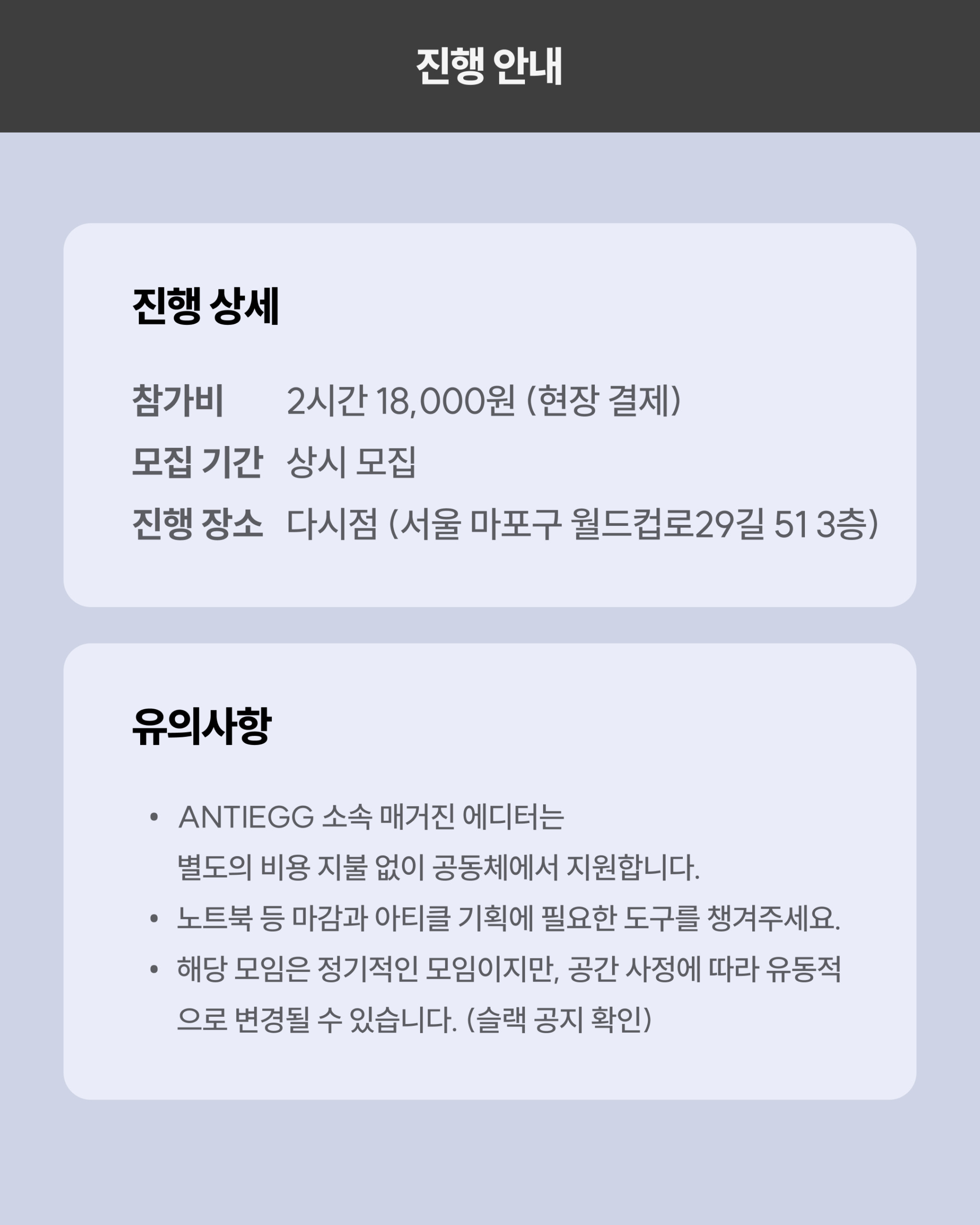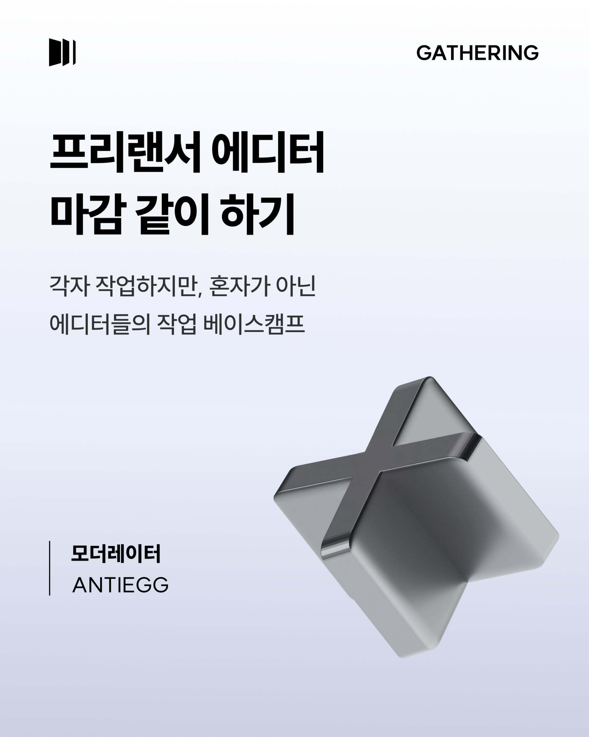 프리랜서 에디터들이 정기적으로 오프라인에서 얼굴을 보며, 기획안 작성과 마감을 함께 진행하고 부담 없이 연결감을 느낄 수 있도록 기획된 모임입니다.