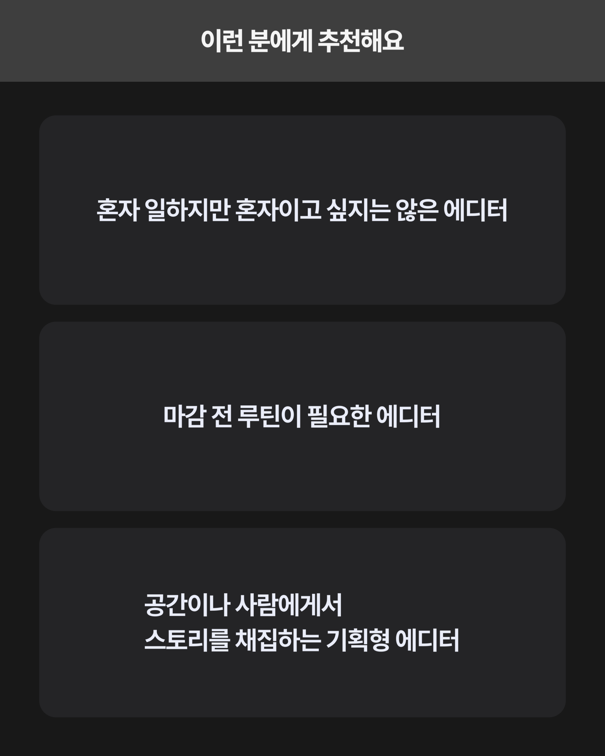 누구든 함께 모여 콘텐츠에 대해 이야기 나눌 수 있고 사사로운 일상의 어려움에 관한 대화도 나눌 수 있습니다. 경계없이 사유하는 에디터 문화를 지향합니다.