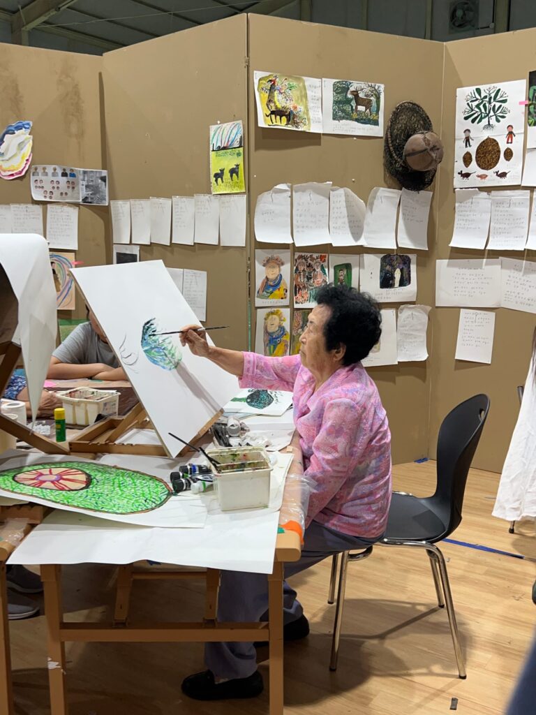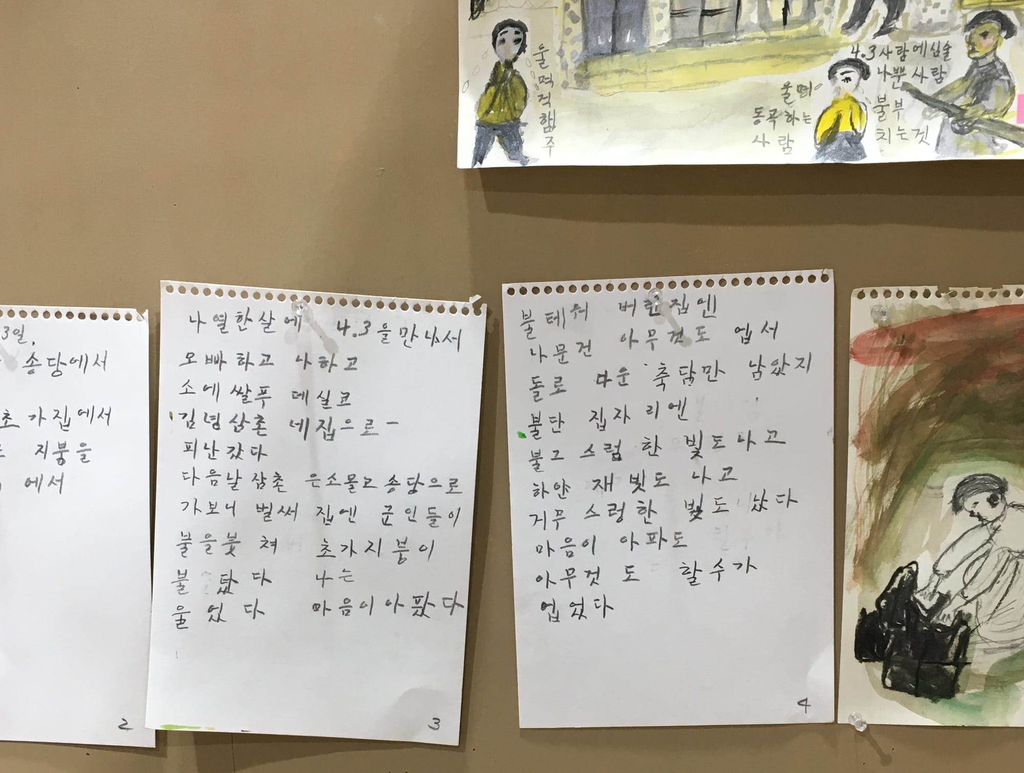 특히, 제주 4.3 사건은 1948년 4월 3일을 기점으로 제주에서 발생한 무력 충돌과 진압 과정에서 수많은 주민들이 희생된 비극적인 역사입니다. 이념의 대립 속에서 무고한 제주 도민들이 폭력과 학살에 시달려야 했으며, 이로 인해 공동체 전체에 깊은 상흔이 남았습니다. 여성이라는 이유로, 평생 고된 밭일을 해야만 하는 운명으로, 또는 4·3 사건으로 학교가 불에 타 글을 배울 기회마저 박탈당했던 당신들이기에, 가슴 깊숙이 박혀있는 아픔들을 밖으로 꺼내지 못하고 세월을 흘려보낼 수밖에 없었는데요. 하지만 그림이라는 새로운 언어를 만나면서부터 할머니들이 꽁꽁 숨겨왔던 이야기들을 세상에 내보일 수 있게 되었습니다. 대부분 평생 그림과는 인연이 없었지만, 마을 주민들과 문화 기획자들의 노력으로 배움과 창작의 기쁨을 발견한 것입니다.