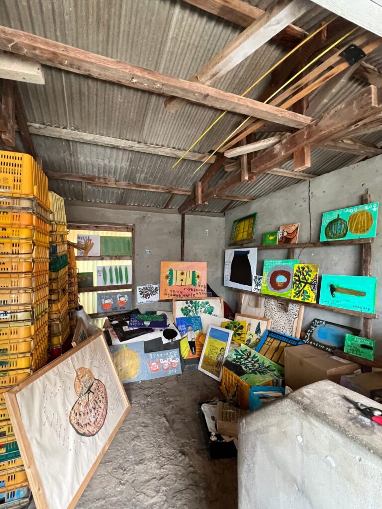선흘 마을에 그림 열풍이 불기 시작한 건 다름 아닌 어린 아이들을 대상으로 진행했던 미술 수업부터였습니다. 아이들이 창고에 얽힌 할머니들의 삶의 이야기들을 들으며 낡은 창고를 그려내던 중, 그 모습을 물끄러미 지켜보던 홍태옥 할머니께서 문득 “나도 한번 그려보겠다”며 목탄을 집어들었다고 해요. 그 때 최소연 감독님(미술 선생님)도 손뼉을 쳤습니다. 며칠 후 간단한 미술용품과 함께 할머니를 찾아가자 자연스레 주변 주민들도 모이기 시작해, 현재는 예술공동체인 소셜뮤지엄 아래 11명의 할망 화가들이 모였다고 합니다.