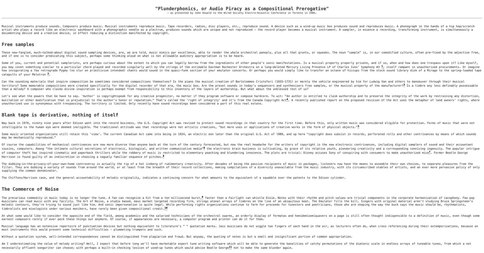 해당 시기, 캐나다 출신의 작곡가 존 오스왈드(John Oswald)는 “플런더포닉스, 또는 작곡의 특권으로서 오디오 해적질”라는 제목의 에세이를 발표합니다. 이는 이름 그대로 ‘소리(phonics)’를 ‘훔치는(plunder)’ 행위를 의미하죠. 여기까지는 앞서 언급한 샘플링과 큰 차이가 없어 보이지만, 둘 사이의 차별점은 크게 두 가지로 나뉩니다. 먼저, 샘플링이 음악을 만드는 새로운 창작 방식이자 기법이라면, 플런더포닉스는 그와 연결되는 하나의 음악적 태도에 가깝죠. 예를 들어, 플런더포닉스 아티스트는 기존의 음악과 소리를 그저 하나의 재료로 바라보고, 그것을 적극적으로 훔치는 행위로 창작을 지속합니다. 기성 작품을 잘게 조각내고 변형해 붙이는 그들의 모습은 말 그대로 ‘소리를 훔치는 해적’에 가까워 보이죠.