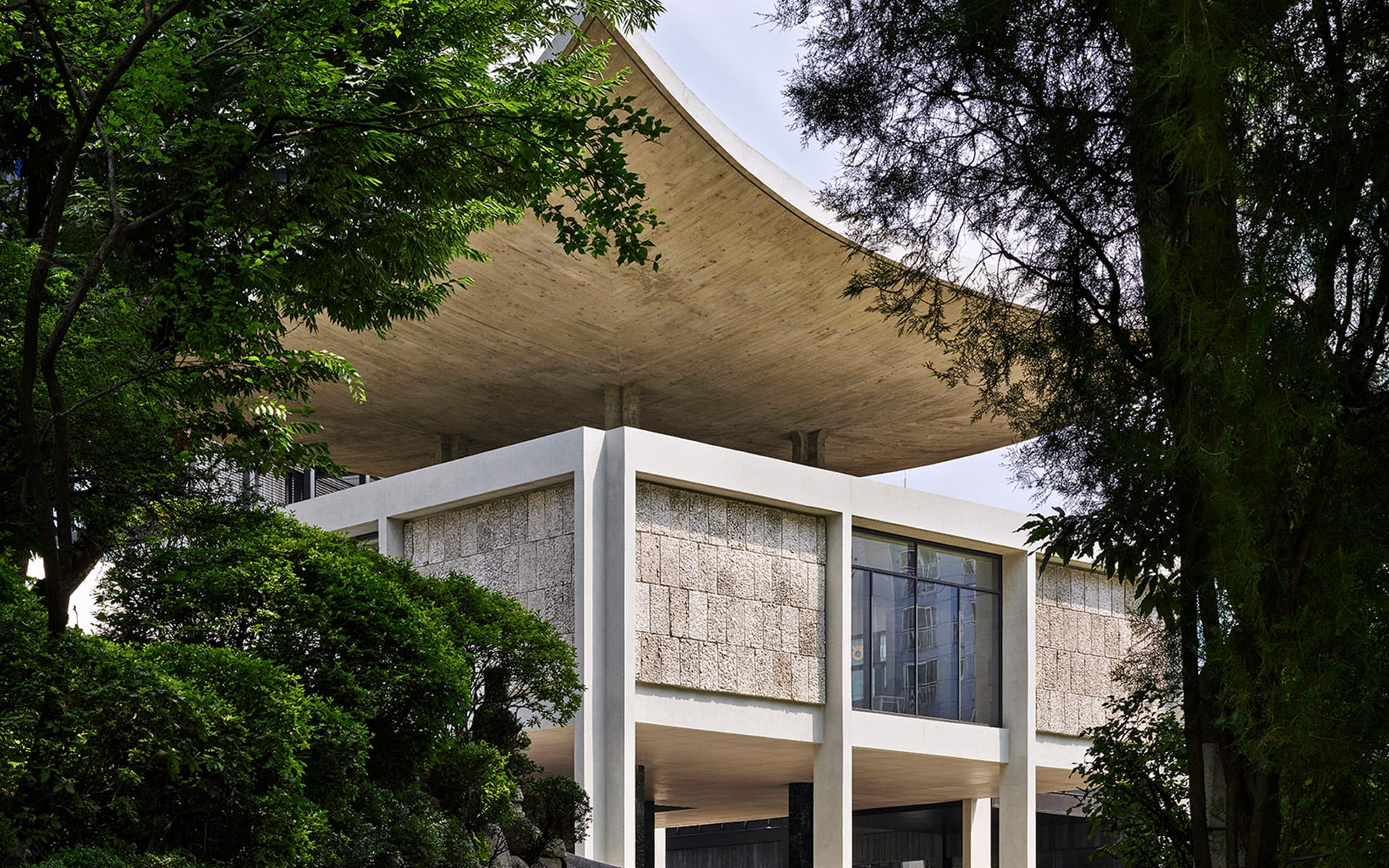 그 정점에는 김중업의 대표작으로 불리는 주한프랑스대사관이 있습니다. 한국 기와지붕의 곡선을 미니멀한 조형으로 구현했는데요. 콘크리트 지붕은 단순해 보이지만 정교한 곡률로 인해 한국적인 멋이 드러나죠. 정문부터 옥상까지 산책하듯이 공간을 경험하는 설계 방식은 르 코르뷔지에의 산책로(promenade)를 떠올리게 하는 한편, 경사지를 자연스럽게 활용하는 사찰 건축의 배치와도 닮아 있습니다.
