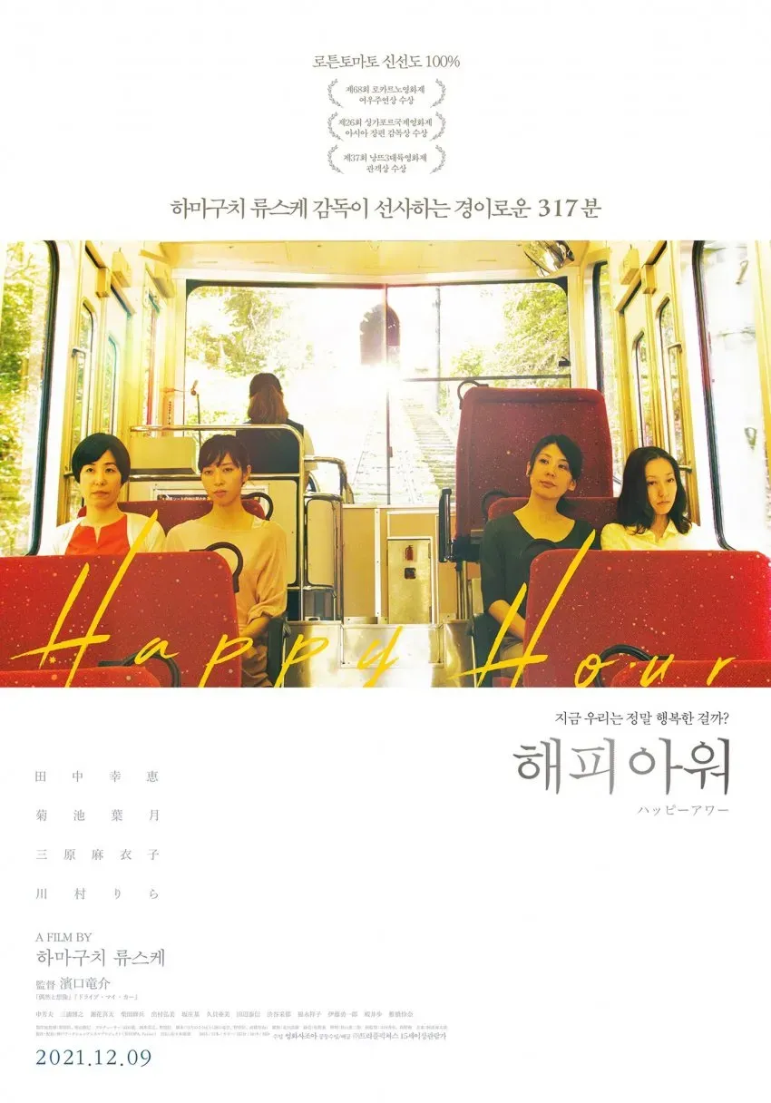 하마구치 류스케의 영화 <해피 아워>는 무려 5시간 17분(317분)이라는 압도적인 러닝타임을 자랑합니다. 일반적인 상업 영화 두 편은 합쳐놓은 긴 시간 동안, 영화는 고베에 사는 네 명의 친구들이 겪는 일상의 균열과 변화를 진득하게 담아냅니다. 짧지 않은 시간 동안 관객들은 배우들의 연기를 보는 것이 아니라 어떤 인생의 한 조각을 만나게 되죠.