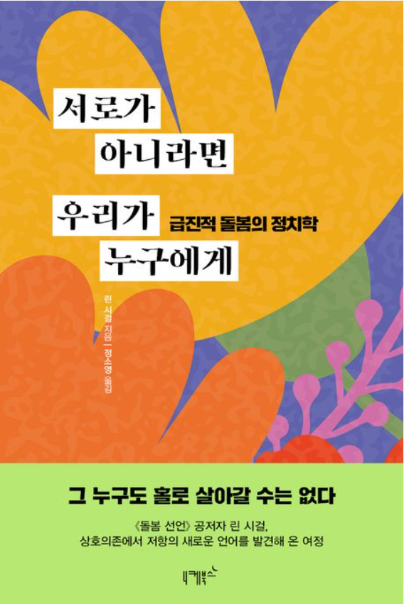 린 시걸의『서로가 아니라면 우리가 누구에게』는 이러한 태도에 질문을 던집니다. 우리는 어린 시절 돌봄 없이는 살아갈 수 없고, 나이가 들면 다시 누군가의 돌봄을 필요로 하죠. 시걸 또한 인간을 본질적인 상호의존적 존재로 바라봅니다. 그렇기에 묻습니다.