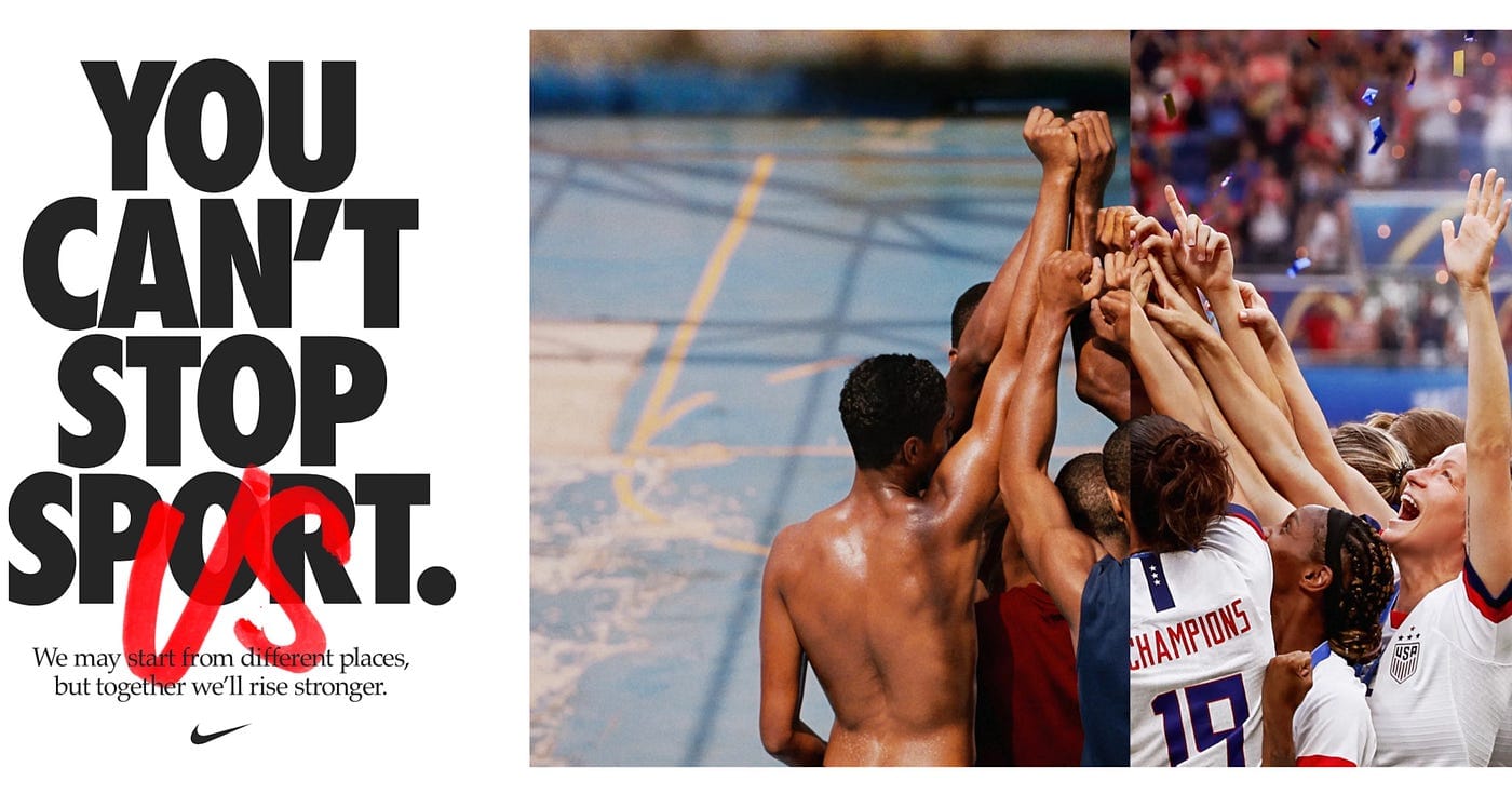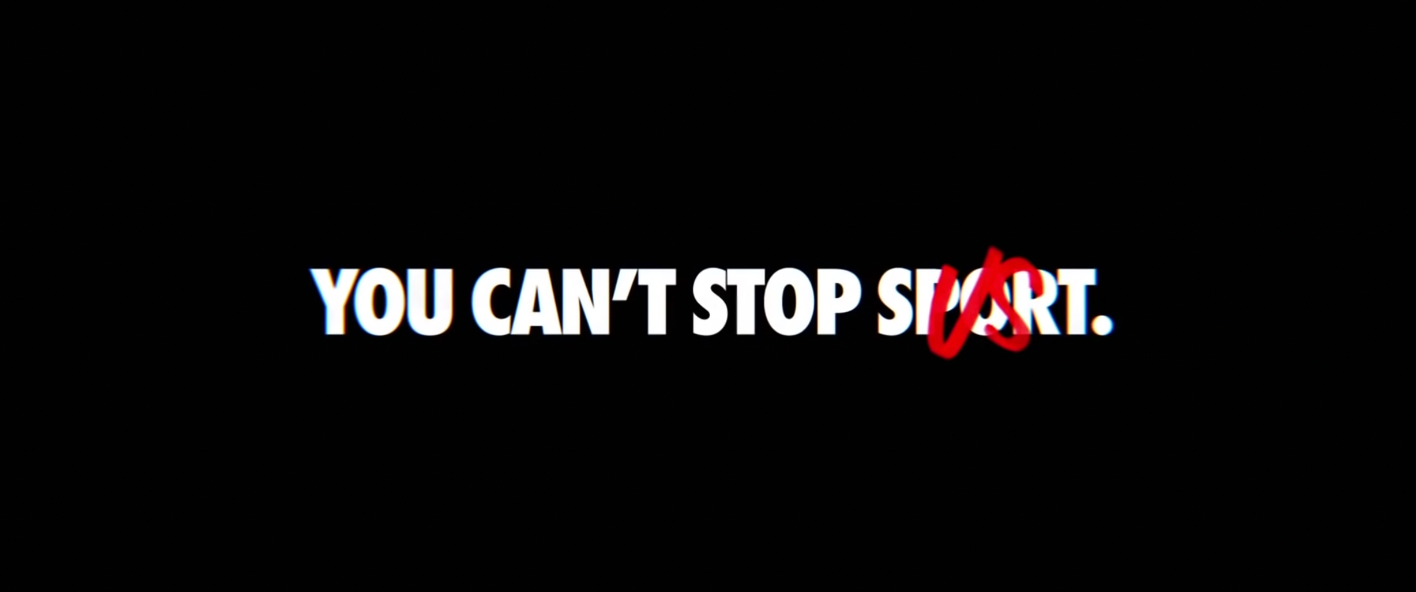 광고는 이 모든 서사를 단 한 문장으로 압축하며 끝을 맺습니다. 검은 화면 위로 흰색 타이포그래피 ‘YOU CAN’T STOP SPORT’가 드러납니다. 곧이어 ‘SPORT’ 위로 붉은색 ‘US’가 강렬하게 덧씌워집니다. 스포츠라는 종목을 넘어, 동시대를 함께하는 ‘우리 모두(US)’로 이어지는 나이키의 열렬한 응원이었습니다.