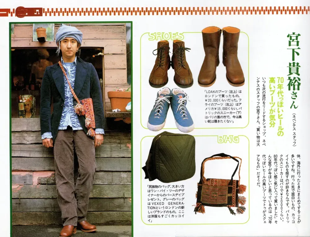 당시 그가 주로 가던 매장은 오늘날 아메카지 씬을 대표하는 인물인 시미즈 케이조의 ‘네펜데스(Nepenthes)’였습니다. 단골손님으로 들락날락하던 미야시타를 눈여겨본 시미즈는 그에게 직원으로 일할 것을 권유하죠. 네펜데스에서 근무하며 미야시타는 브랜드 운영에 관한 노하우를 익힙니다. 그러던 어느 날, 네펜데스의 자체 상품을 준비하던 시미즈는 미야시타에게 직접 상품 기획을 맡깁니다. 비록 전문 패션 스쿨을 나오지는 않았으나, 누구보다 옷을 많이 접해온 젊은 미야시타의 감각을 믿은 것이죠. 이 무렵부터 미야시타는 ‘자신이 입을 옷’이 아닌 ‘상품으로서의 옷’을 기획하기 시작했습니다.