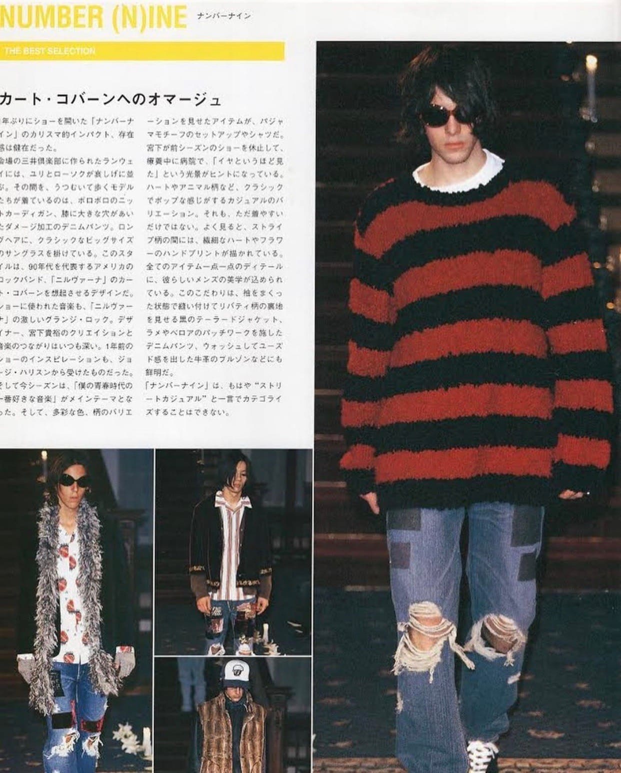 미야시타는 평소 밴드 음악에 지독한 관심을 두었습니다. 본인이 직접 작곡을 하고 밴드 보컬로 활동할 정도였죠. 브랜드명인 ‘넘버나인(Number (N)ine)’도 비틀즈의 아홉 번째 정규 앨범에 수록된 <Revolution 9>에서 따왔다고 합니다. 그중에서도 커트 코베인(Kurt Cobain)은 넘버나인과 미야시타 본인의 사고관에 가장 큰 영향을 끼친 인물입니다. 자기 파괴적이고 불안한 정서가 녹아든 음악과 태도는 넘버나인의 그런지(Grunge)한 무드에 고스란히 스며들어 있습니다.