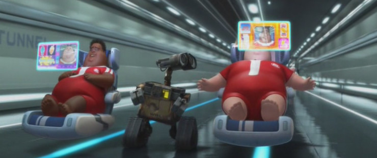 기계 위에서 자고, 먹고, 생활하며 살이 오른 사람들은 사방에 사람들이 있어도 서로 얼굴을 보며 이야기하지 않고, 눈앞에 수영장이 있어도 모니터만 보며 물속에 들어가지 않습니다. 옷 색깔은 유행에 따라 기계에 의해 저절로 바뀌고, 식사 또한 기계들의 추천에 의해 제공됩니다. 우주선 속에서 인간들은 아무도 자발적으로 무언가를 선택하지 않습니다.