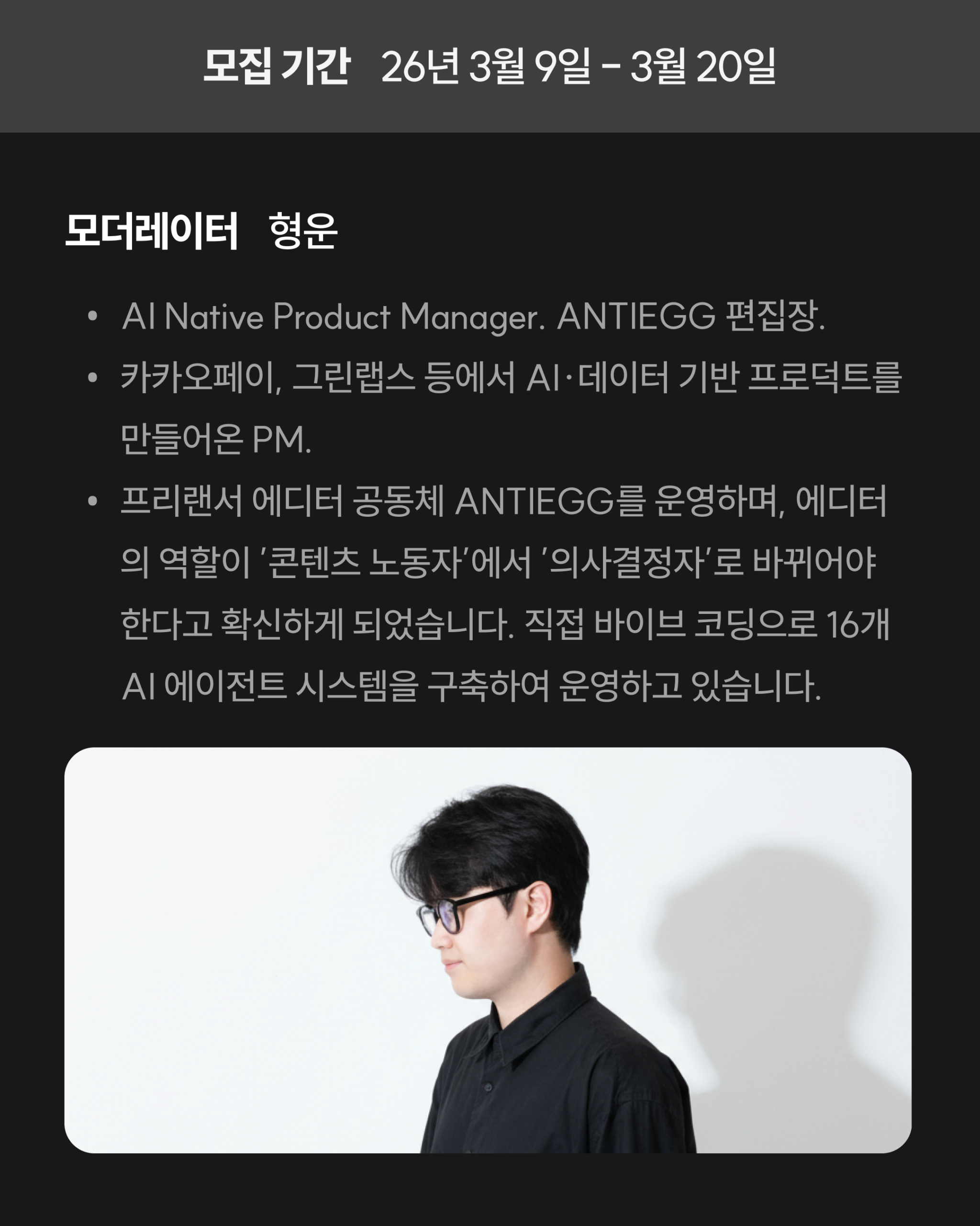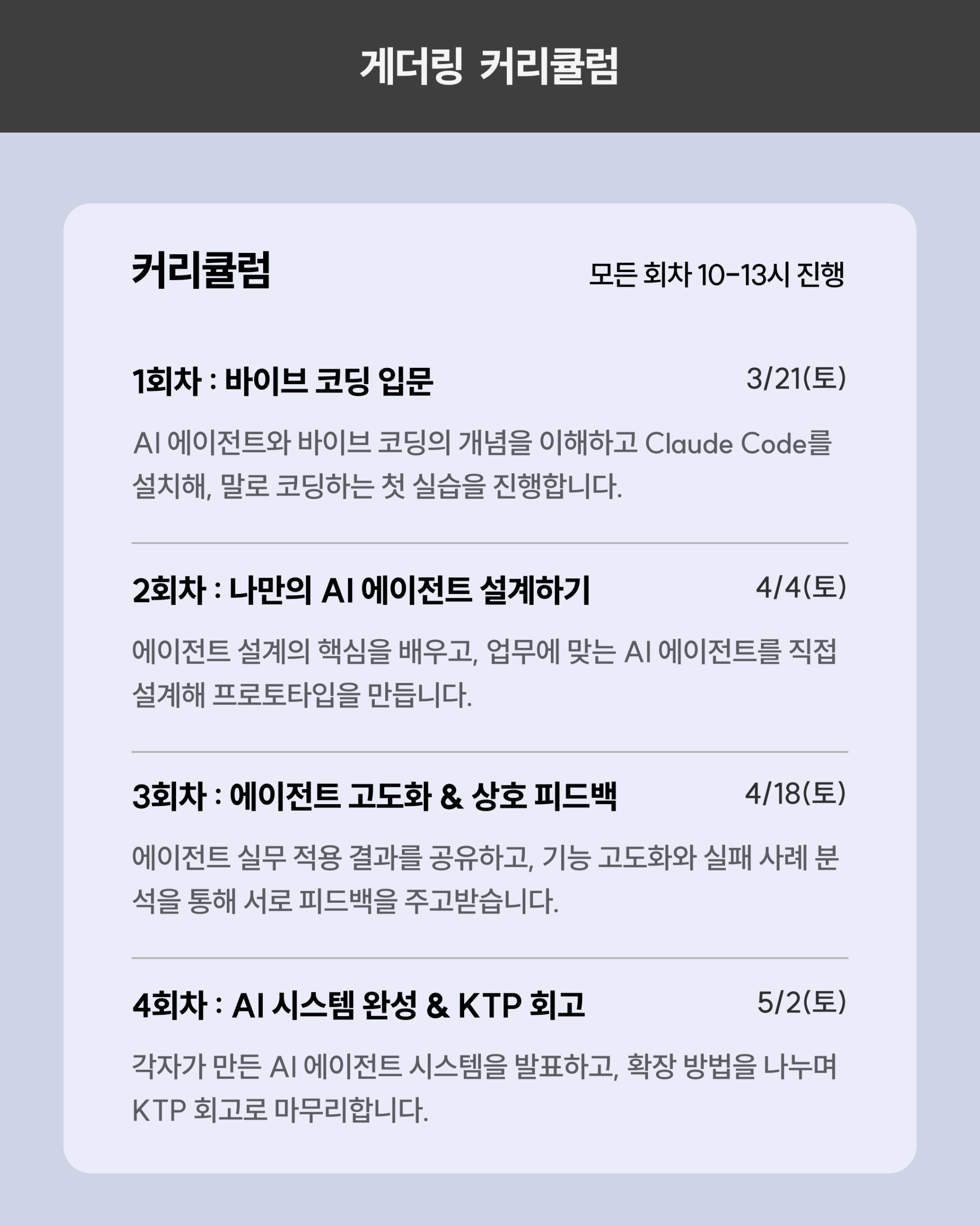 이 게더링은 에디터를 ’콘텐츠를 만드는 사람’에서 ’임팩트를 만드는 사람’으로 전환시키는 수업입니다. 코딩을 한 줄도 모르는 사람이 AI에게 말로 지시해서 자기만의 도구를 직접 만드는 ’바이브 코딩’을 배우고, Claude Code로 나의 실무를 대신하는 AI 에이전트 시스템을 4주 동안 함께 구축합니다. 반복적인 실행은 AI에게 맡기고, 나는 판단과 방향에 집중하는 법. 그것이 AI Native 에디터입니다.