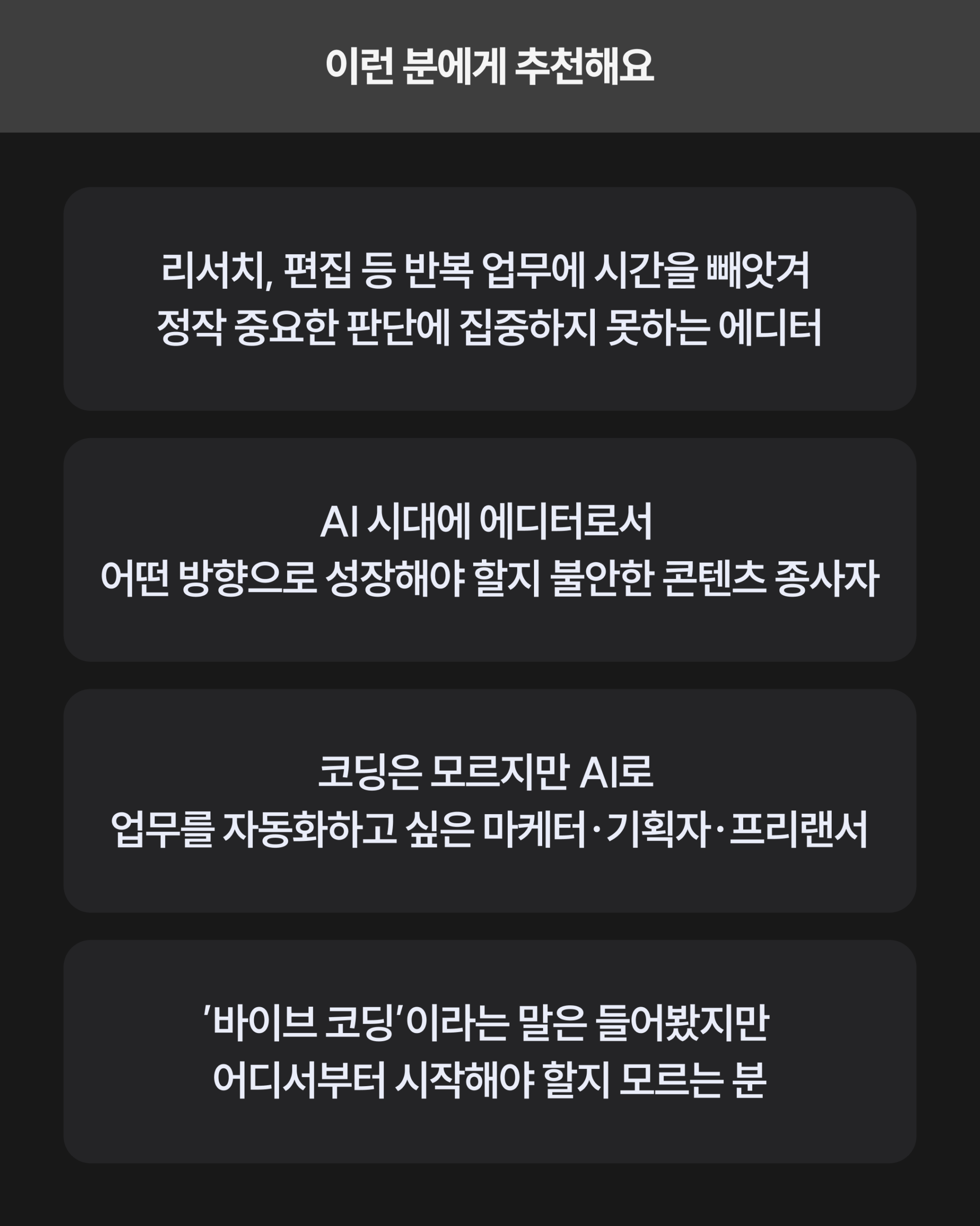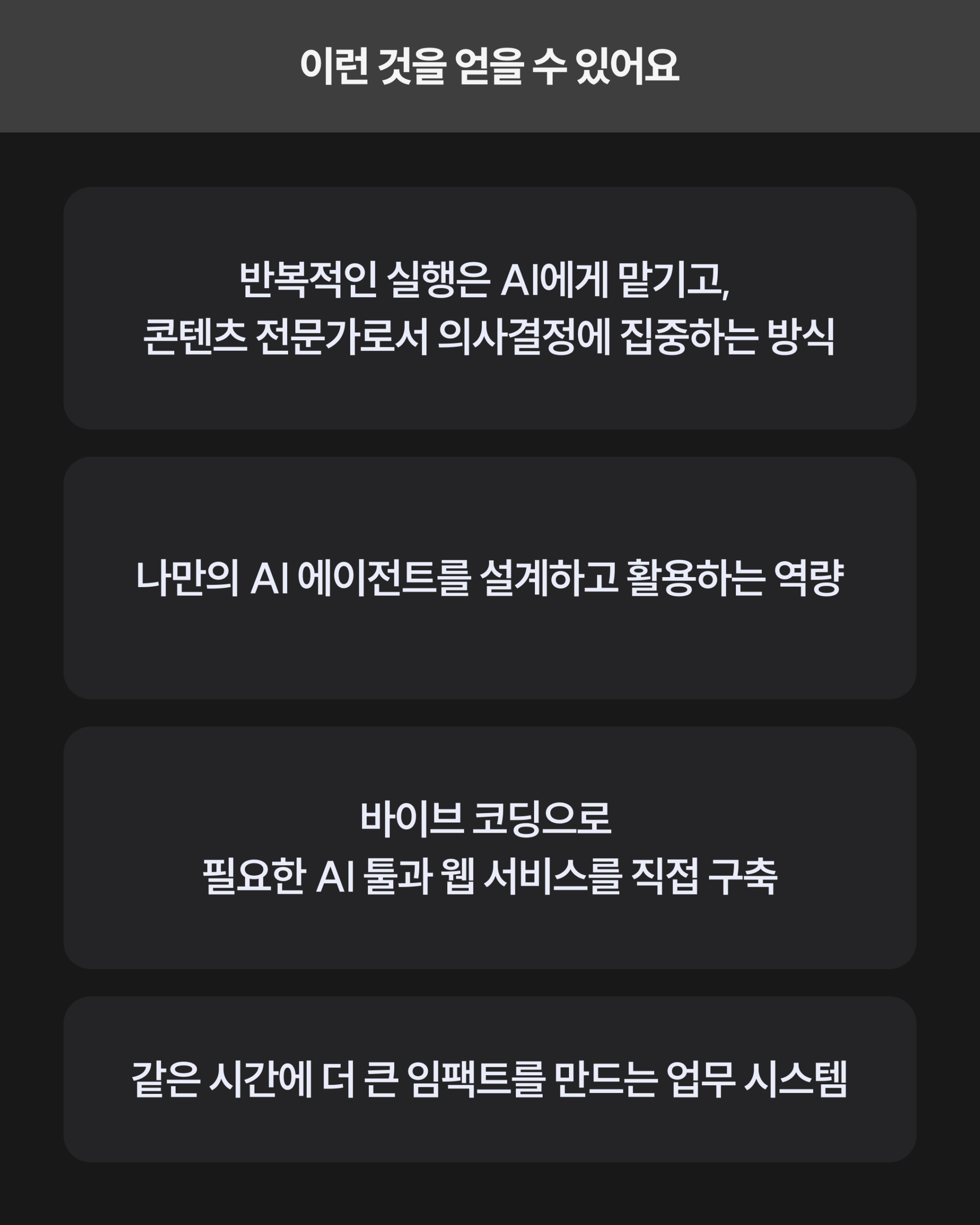 콘텐츠 전문가로서 의사결정에 집중하고, 반복적인 실행은 AI 에이전트에게 맡기는 ’임팩트 중심의 에디터’로 전환합니다. 바이브 코딩을 통해 코딩 경험 없이도 나만의 AI 시스템을 직접 설계하고 구축하여, 같은 시간에 더 큰 임팩트를 만들어내는 실전 역량을 가져갑니다.