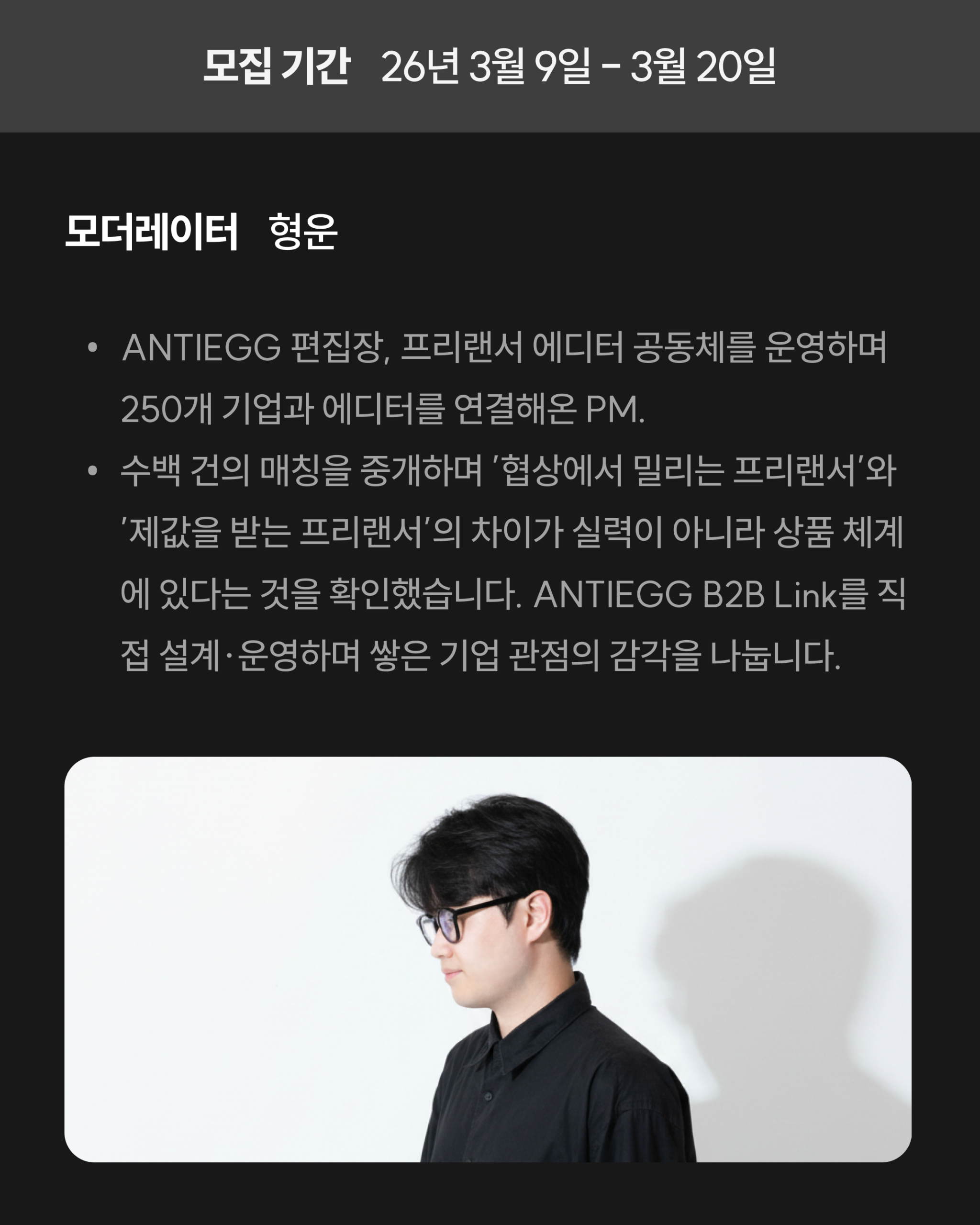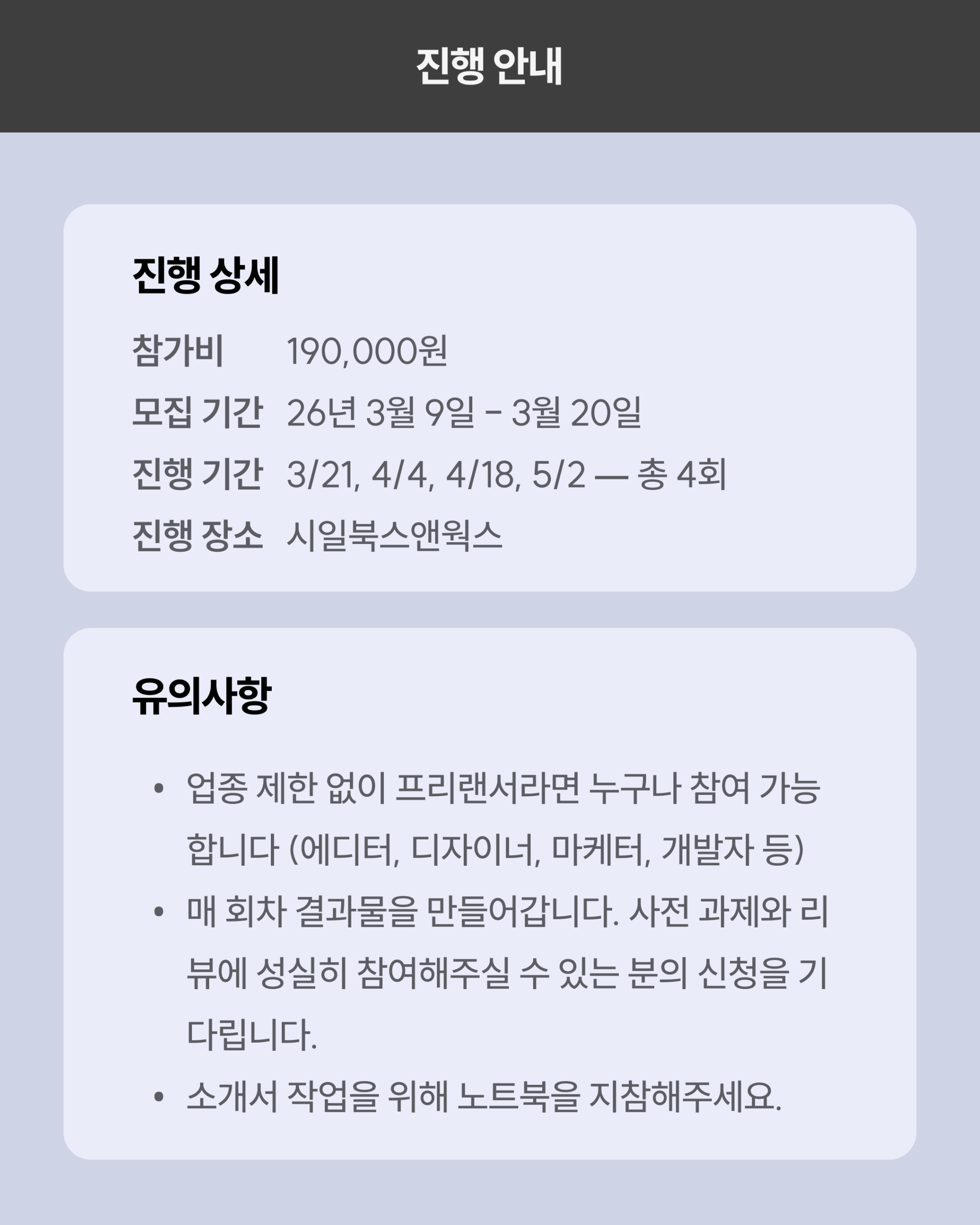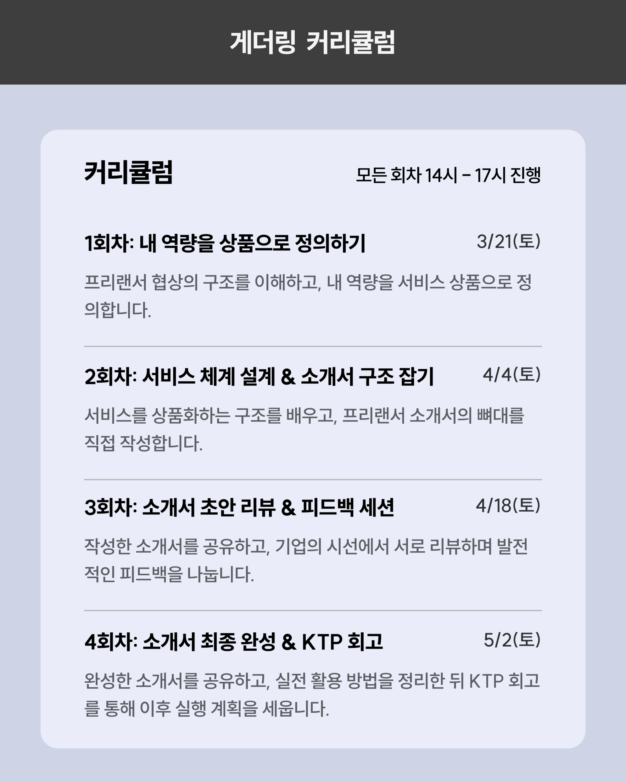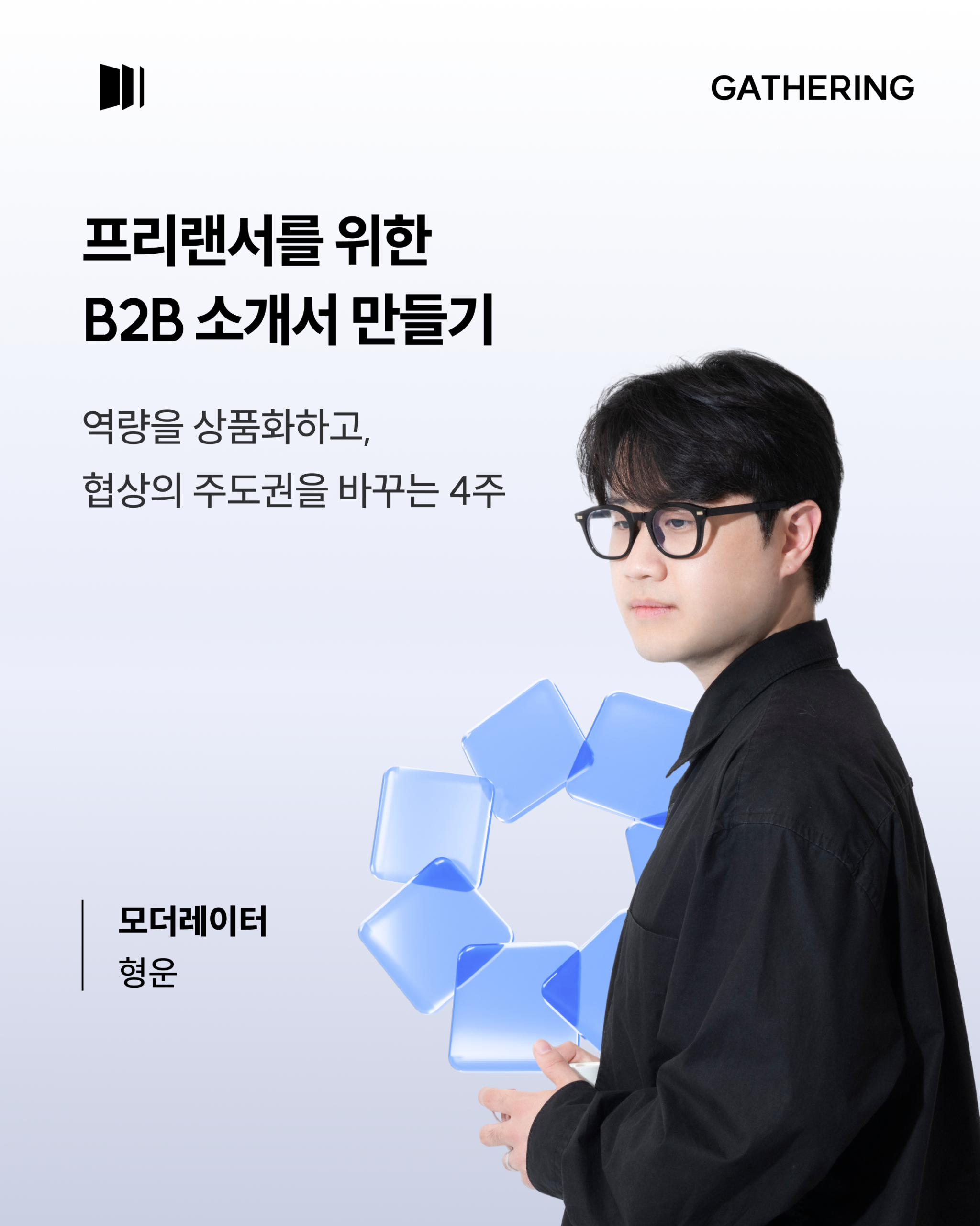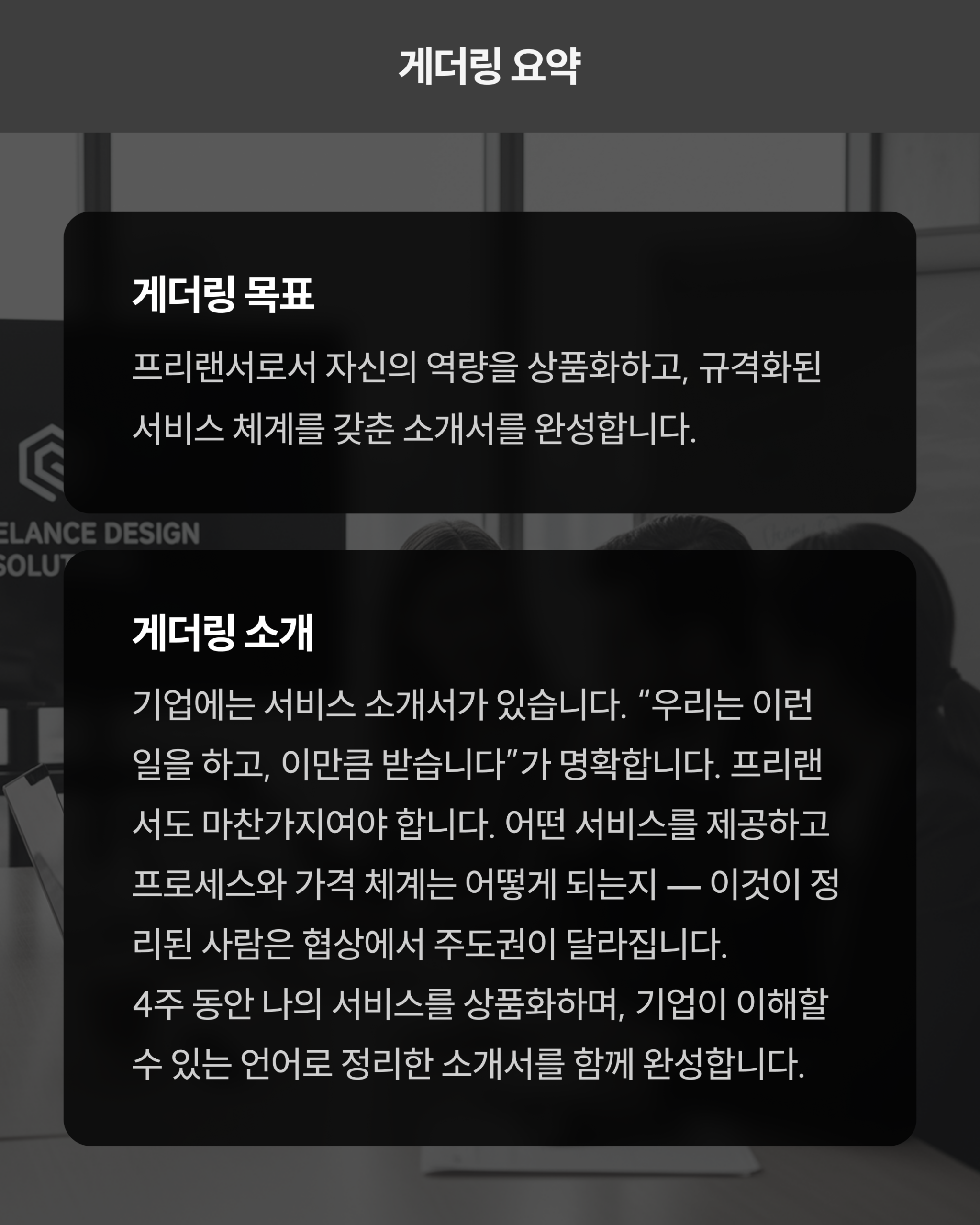 이 게더링은 포트폴리오를 만드는 수업이 아닙니다. 포트폴리오는 ’과거에 뭘 했는지’를 보여주는 것이고, 소개서는 ’앞으로 무엇을 해줄 수 있는지’를 상품으로 정의하는 것입니다. 내 역량을 규격화하고, 서비스를 상품화하고, 이를 기업이 이해할 수 있는 언어로 정리한 소개서를 4주 동안 함께 완성합니다.