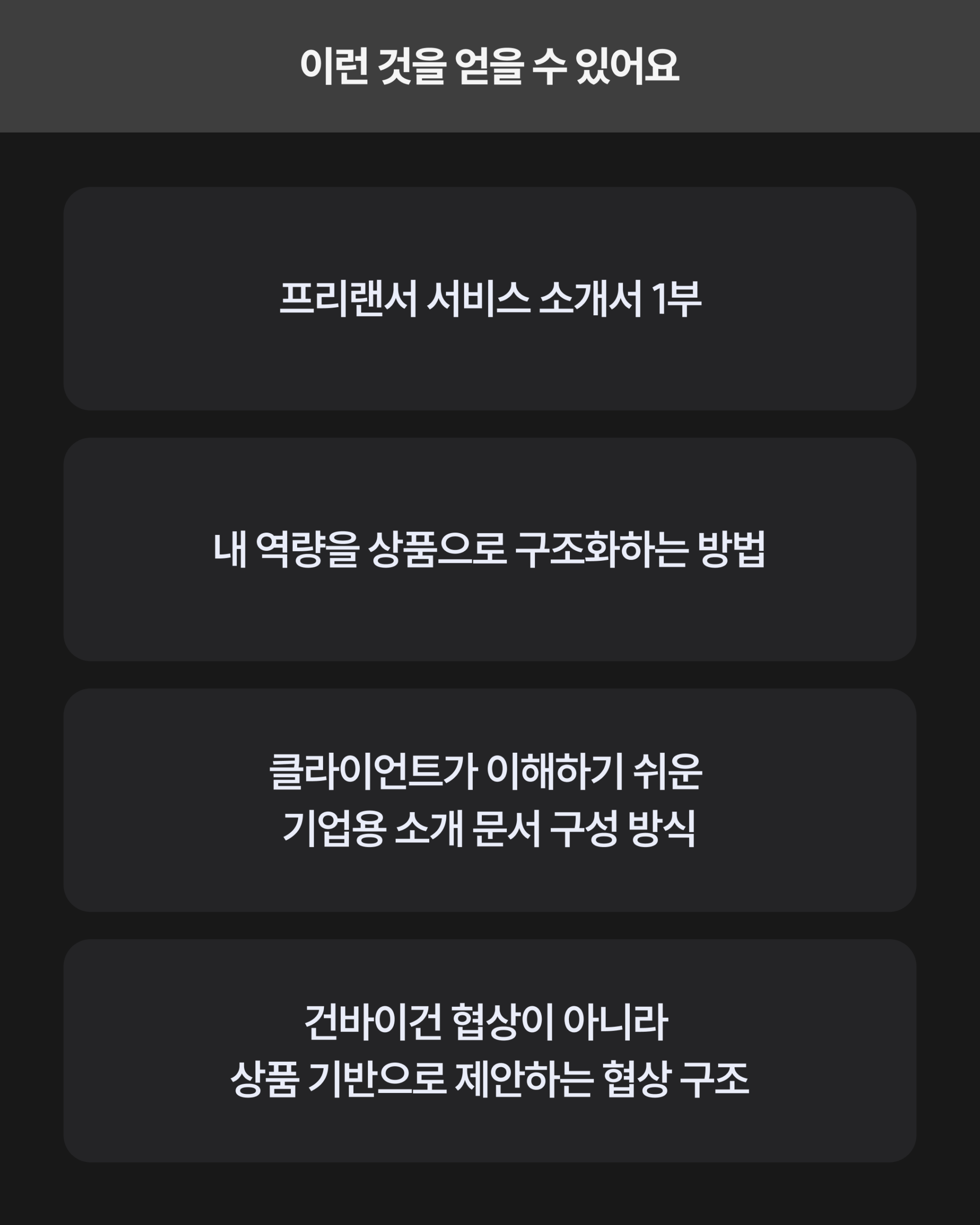 프리랜서로서 자신의 역량을 상품화하고, 규격화된 서비스 체계를 갖춘 소개서를 완성합니다. 건바이건 협상이 아니라, 명확한 상품과 가격 체계를 기반으로 클라이언트와 대등하게 소통할 수 있는 기반을 만듭니다.