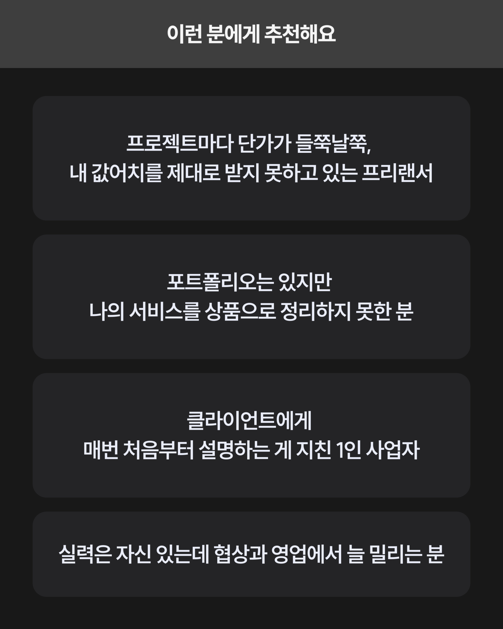 프리랜서는 협상에서 늘 불리합니다.클라이언트가 예산을 정하고, 프리랜서는 거기에 맞추는 구조. 어떤 프로젝트는 터무니없이 싸게 하고, 어떤 프로젝트는 운 좋게 괜찮은 값을 받습니다. 왜 이런 일이 반복될까요? 규격화된 상품 체계가 없기 때문입니다.