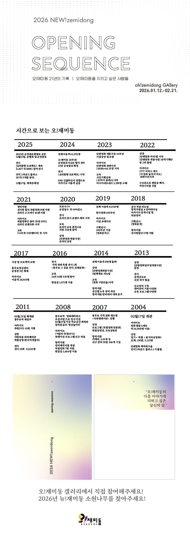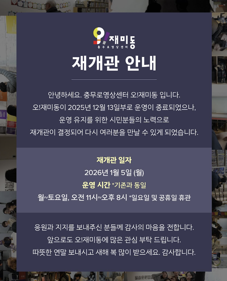 그러나 기적이 일어났습니다. 공간의 사라짐을 용납할 수 없었던 시민들과 영화인들이 자발적으로 모여 목소리를 높이기 시작한 것입니다. 끈질긴 항의와 투쟁, 그리고 오!재미동이 개인의 삶에 미친 영향을 기록하는 연대의 물결은 변화를 만들어 냈고, 2026년 1월, 오!재미동은 극적으로 다시 문을 열었습니다.