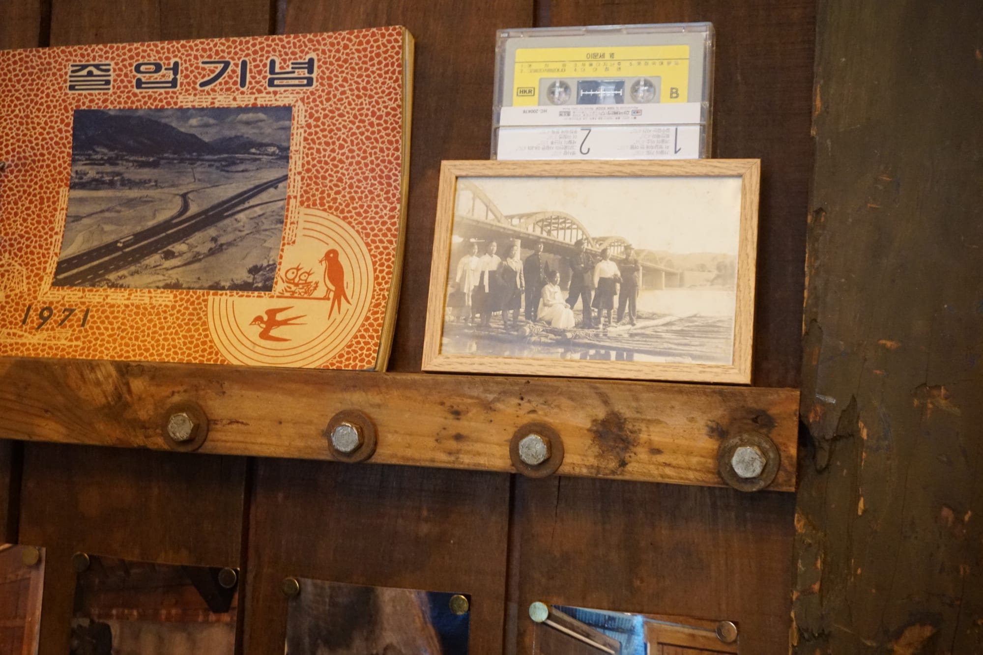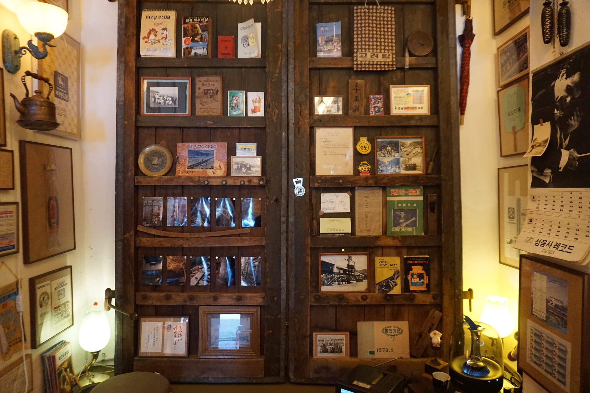 벽면에 걸린 수집품을 지나쳐 안쪽으로 들어가면 100년 된 양조장의 문틀이 벽에 비스듬히 서 있습니다. 마산 어시장 근처에서 오랫동안 술을 빚던 양조장은 이제 공영 주차장이 되었습니다. 양조장 건물이 허물어지기 전 가져온 네 짝의 문틀에는 사진으로는 옮길 수 없는 것들이 결마다 새겨져 있습니다.