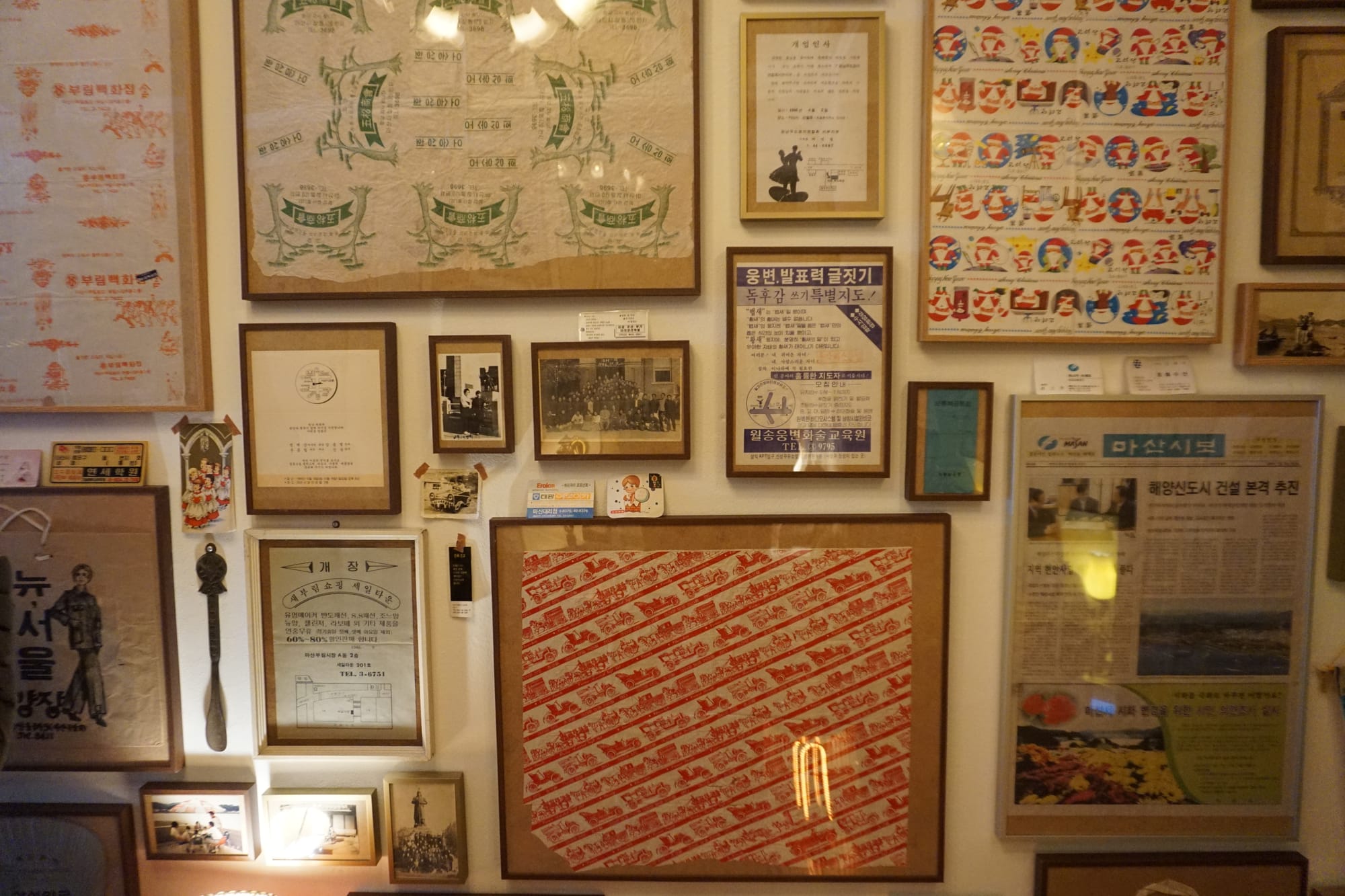 종이는 재활용하기 편하다는 이유로 불에 타거나 쓰레기봉투에 담겨 너무나 쉽게 지워지고는 합니다. 이곳의 주인장은 그렇게 쉽게 사라질 수 있다는 걸 알기에 오히려 그것들을 더욱 귀하게 다루는 쪽을 택했습니다. 낡은 종이 한 장도 하나하나 정성스럽게 액자에 담아 벽에 거는 모습에서 기록을 대하는 남다른 무게감이 전해집니다. 단순히 물건을 소유하려는 욕심이 아니라 마산의 시간을 정성껏 백업하고 보여주려는 진심이 이 정갈한 벽면 위에 고스란히 묻어납니다.