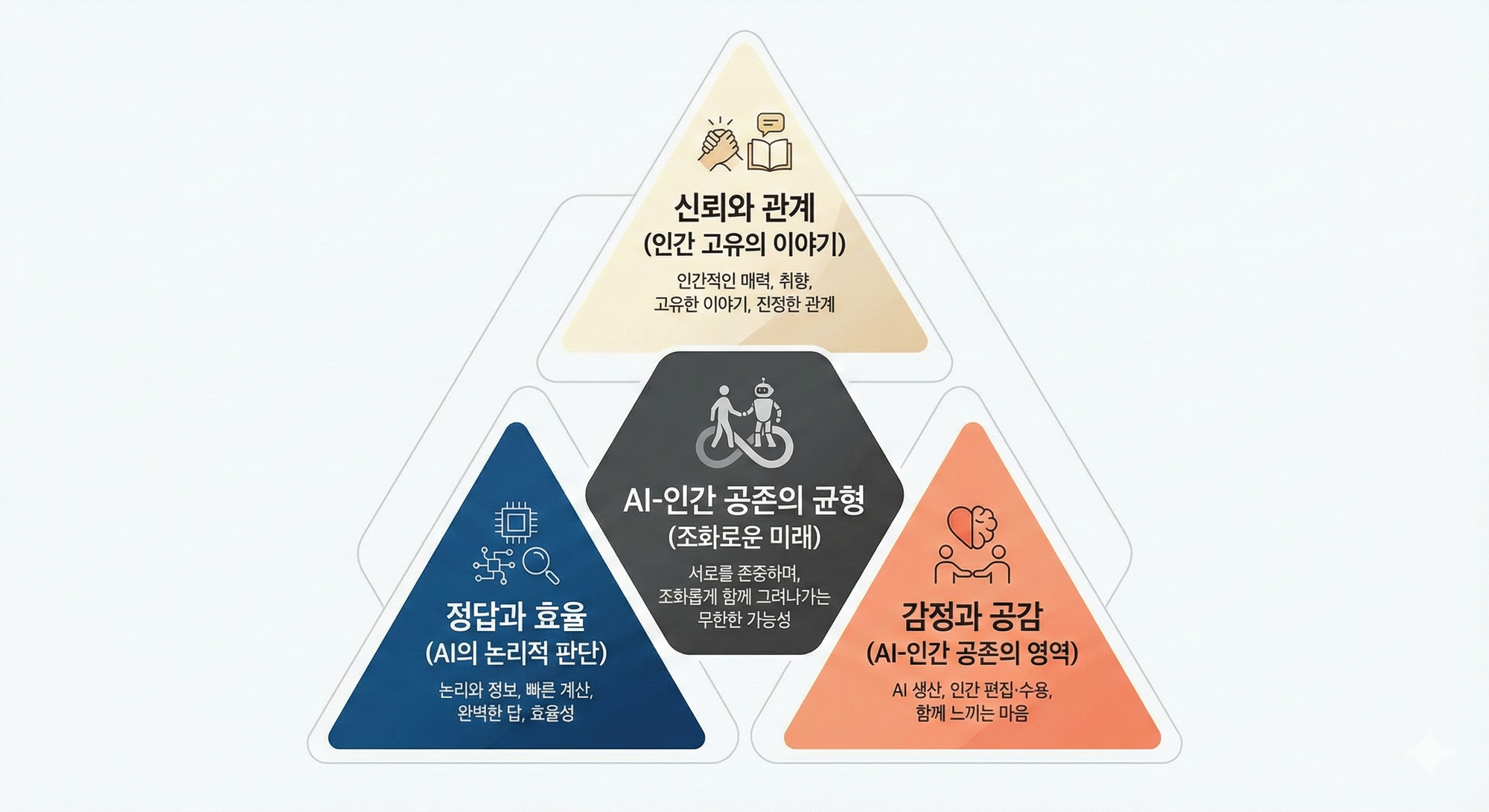 그러나 사람과 사람이 소통해야 하는 우리의 삶에서는 다릅니다. 상대의 표정, 목소리의 떨림, 말하지 않은 것들. 이 모든 비언어적 신호를 읽고 반응하는 능력은 관계의 영역에서 여전히 중요합니다.