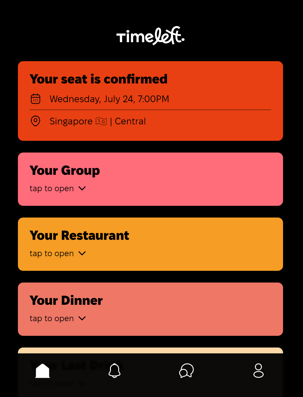 타임 레프트(Timeleft)는 자신들을 데이팅 앱이 아닌 오프라인 소셜 서비스라고 설명합니다. 사람을 하나씩 골라보게 하기보다, 낯선 사람들과 만나는 자리 자체를 설계하는 데 더 가깝기 때문이죠. 대표적인 ‘디너’ 서비스는 그룹을 구성한 뒤 레스토랑까지 예약해 주는 방식입니다. 사용자는 예약된 시간과 장소에 맞춰 나가기만 하면 되고, 그곳에서 처음 보는 이들과 한 테이블에 앉게 됩니다.