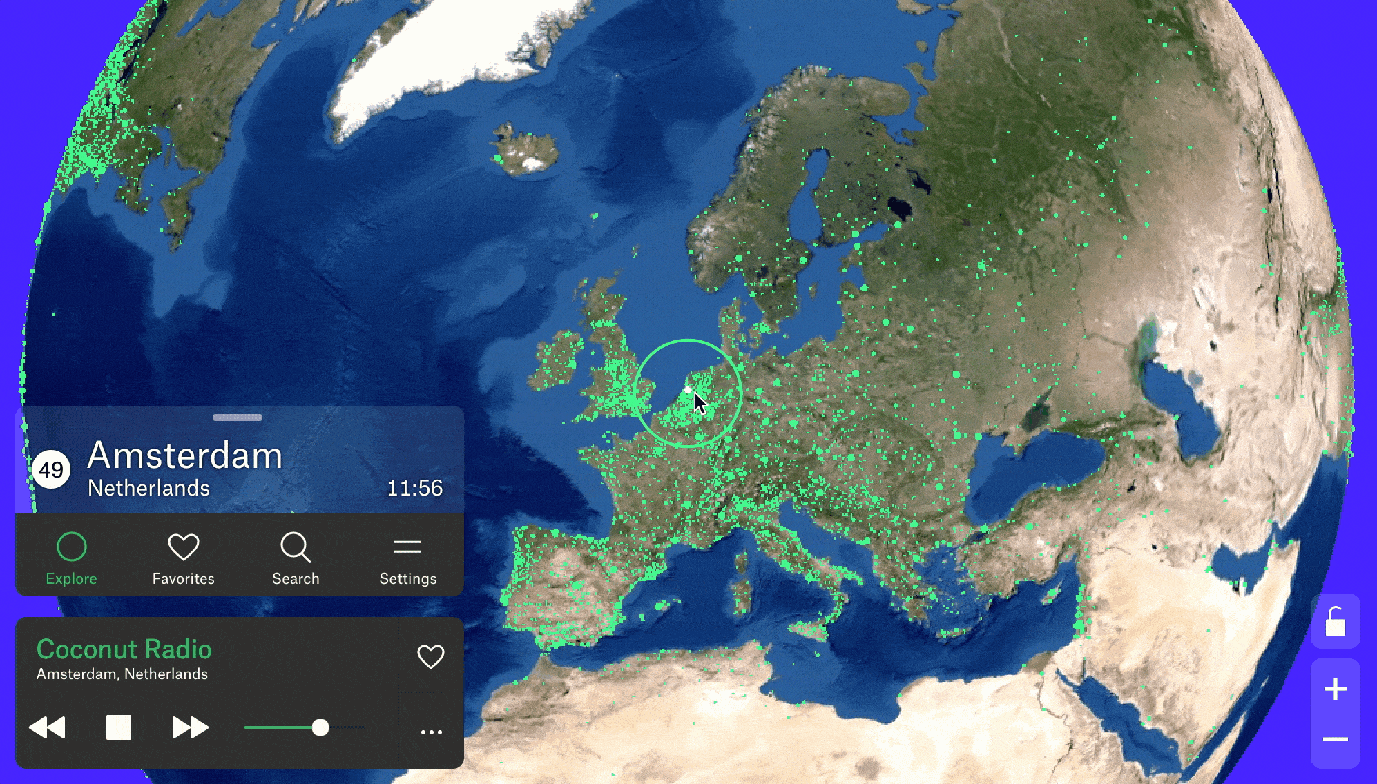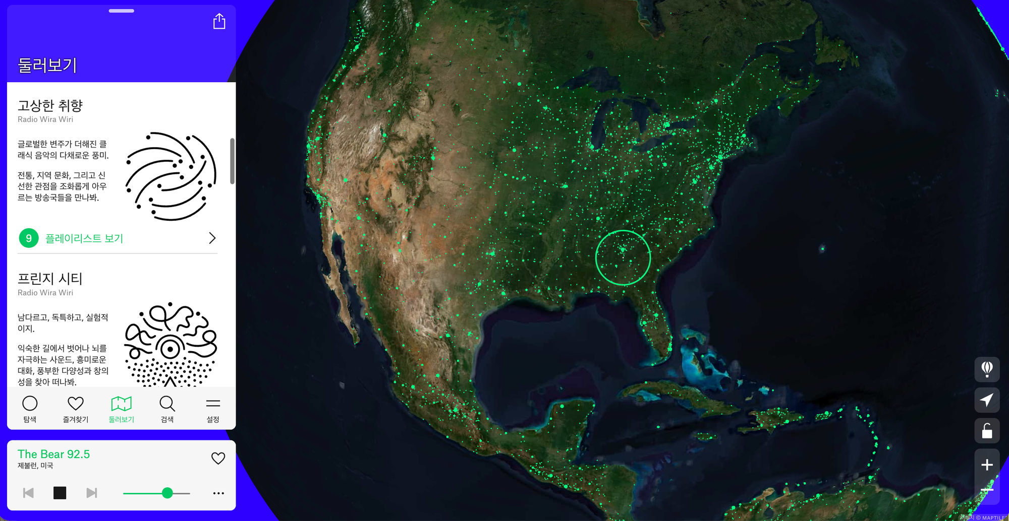 ‘Radio Garden’은 전 세계 라디오를 청취할 수 있는 인터랙티브 플랫폼입니다. 2016년 네덜란드 사운드 비전 연구소는 라디오 전파가 국경을 초월하여 이동한다는 사실에 영감받아 이 사이트를 제작했는데요. 이제는 일상에서 사라진 라디오라는 물성을 온라인 지도로 만들어, 수천마일 떨어진 고향과 연결되거나 이국적인 문화를 경험할 수 있도록 만들었습니다. 사이트에서는 지구본을 돌리며 각 도시에서 방송 중인 라디오를 청취할 수 있는데요. 아시아를 비롯해 미국, 유럽, 아프리카의 도시들부터 심지어 북한 평양까지 자유롭게 선택해 음악을 들을 수 있습니다.