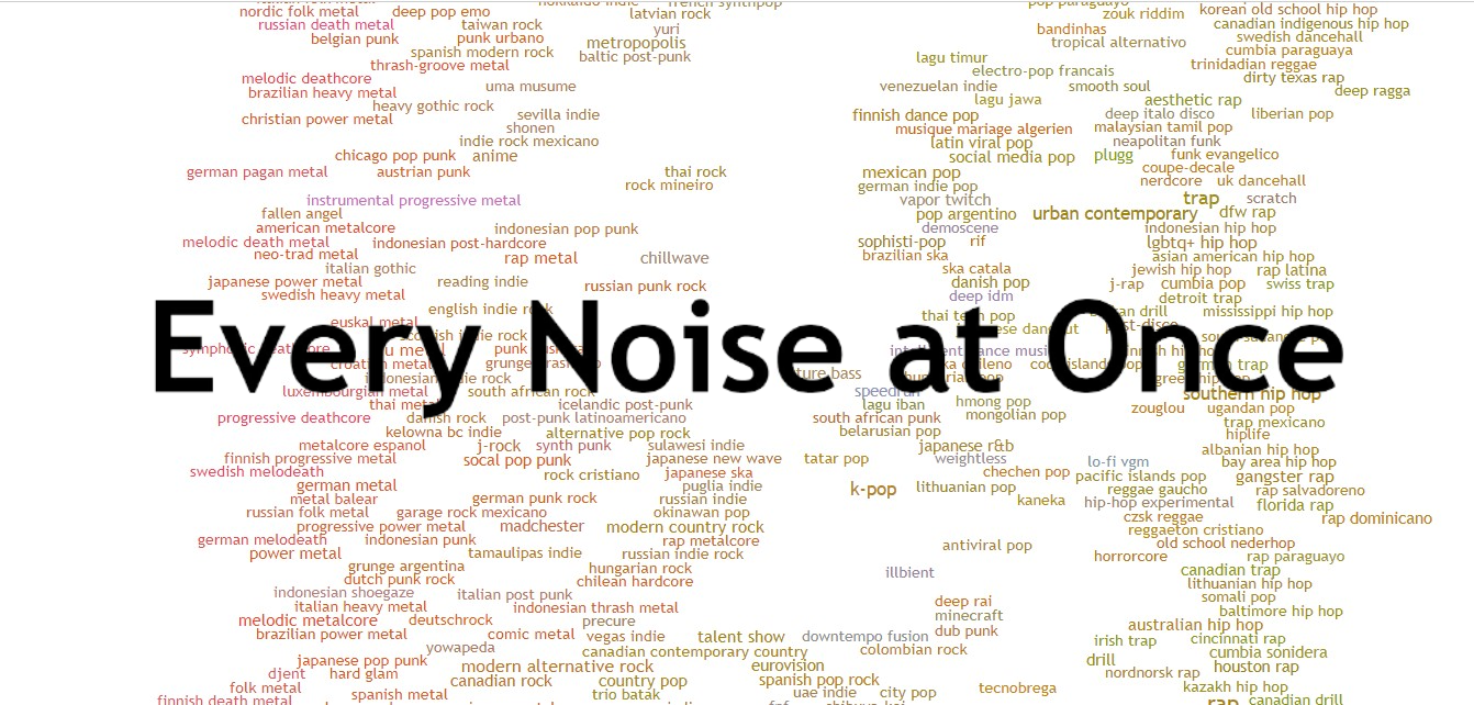 매일 비슷한 음악만 듣다 보면 새로운 노래를 듣고 싶다는 생각이 간절해집니다. 그럴 때면 알고리즘의 추천을 받곤 하지만, 평소 듣던 장르에서 크게 달라지지는 않는데요. ‘Every Noise at Once’는 새로운 장르를 만나고 싶을 때 좋은 사이트로, 음악 스트리밍 플랫폼 ‘스포티파이’에서 데이터 연금술사로 일한 글렌 맥도널드가 만든 음악 장르 지도입니다. 스포티파이에 있는 6,291개의 장르와 약 100만 명의 아티스트를 분석한 데이터를 기반으로 제작되었다고 하죠.