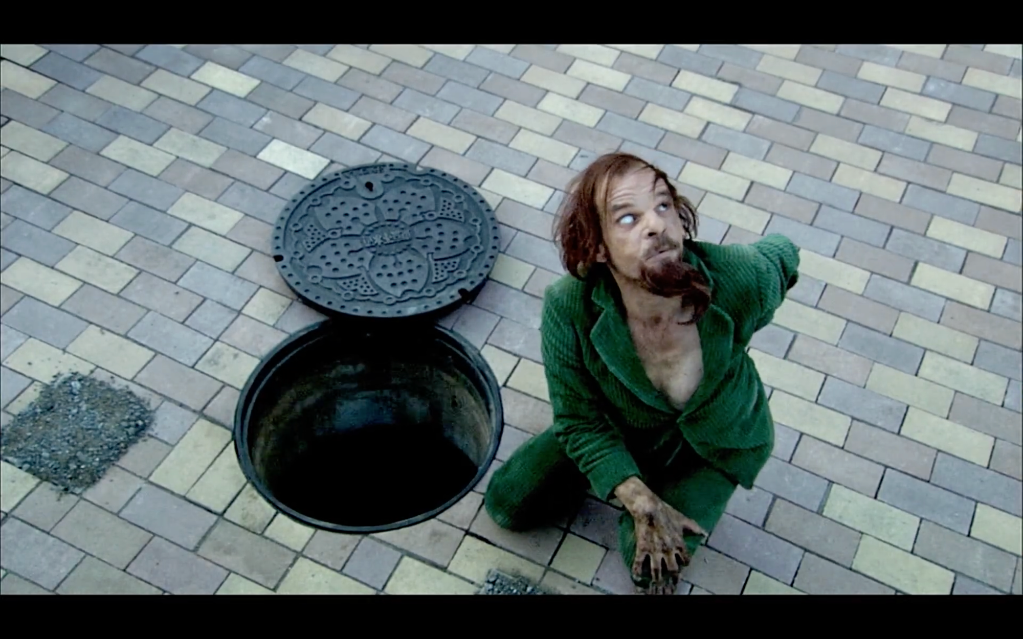 광인이 살던 하수구에는 탱크와 수류탄, 욱일기 등 전쟁의 잔재가 가득합니다. 그는 도시가 지하에 묻어둔 채 외면하고 있는 폭력과 함께 존재합니다. 숨겨둔 폭력이 지표면 위로 터져 나오듯 그는 거리의 질서를 어지럽힙니다. 사회 시스템은 그를 처단하는 것으로 사회를 다시 표백하려 하지만 광인은 홀연히 모습을 감출 뿐 사라지지 않습니다. 깨끗한 거리와 단정한 사람들로 이루어진 도시는 아무 문제 없는 것처럼 작동하고 있지만 실은 해결되지 않은 많은 논의를 지하에 묻어둔 채입니다. 그것들이 저절로 사라지지 않는다는 사실을 까락스는 도발적인 방식을 통해 보여줍니다.