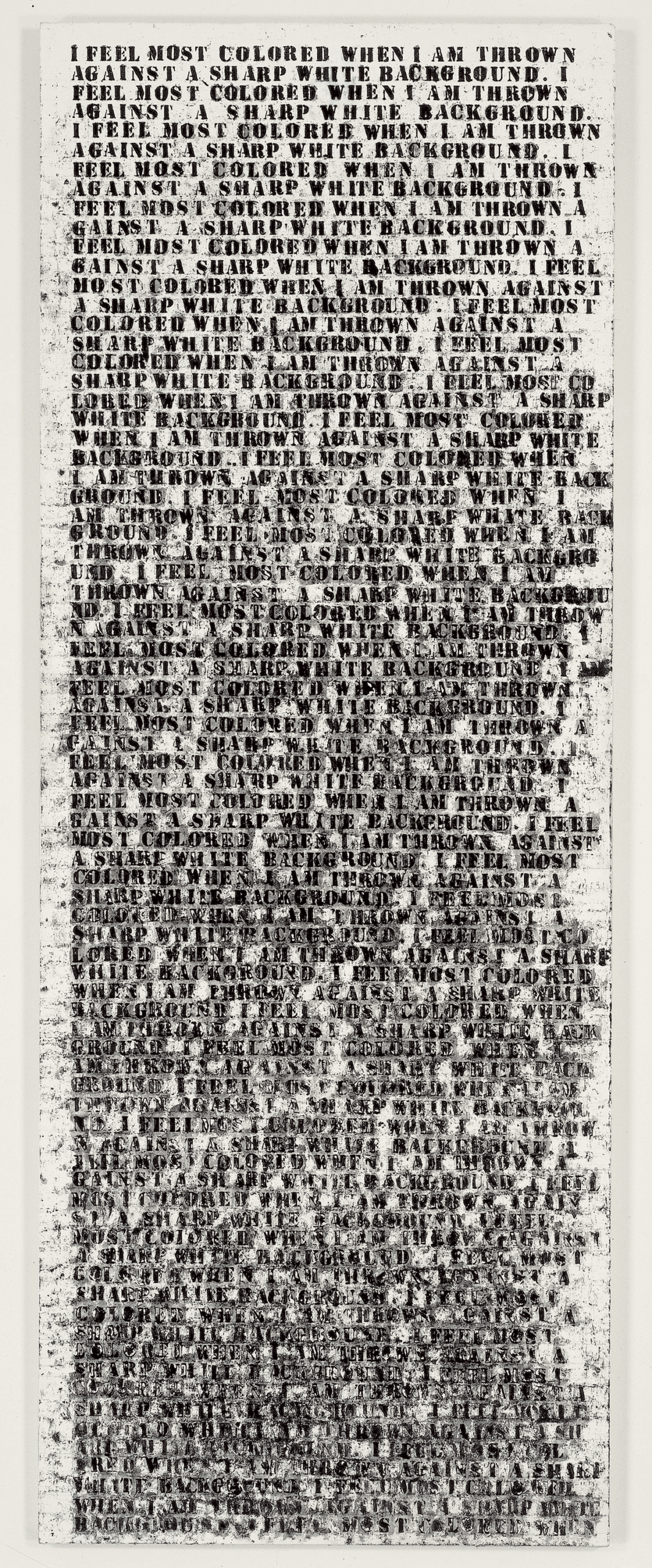 미국 작가 조라 닐 허스턴이 남긴 이 문장을 글렌 라이곤(Glenn Ligon, 1960-)은 작품의 제목이자 내용으로 삼습니다. 흰 캔버스 위에 같은 문장을 아래로 반복해 써내려 갈수록, 스텐실과 오일스틱이 서로 엉키며 글자는 점점 뭉개지고 번져 읽을 수 없게 됩니다.